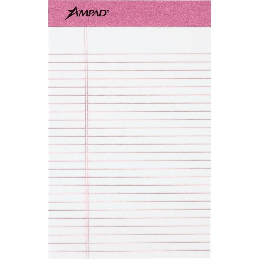 Perforated writing pad is ideal for office and home use. Watermarked paper will not bleed through. Leatherlike, binding at top is stapled and glued. Extra-thick, chipboard back offers stiff support when writing. Sheets are microperforated for clean separation. Pad contains 50 legal/wide-ruled sheets of 16 lb. yellow paper. Each letter-size sheet has 11/32″ line spacings and a 1-1/4″ left margin.