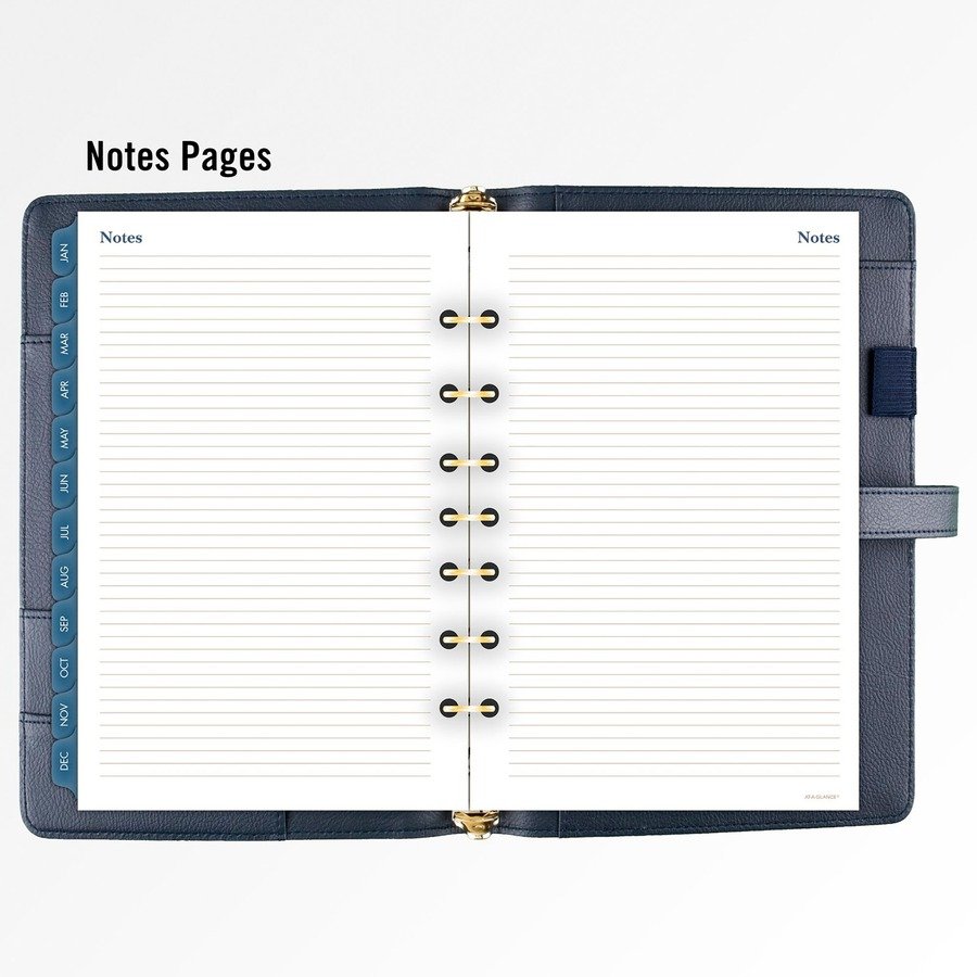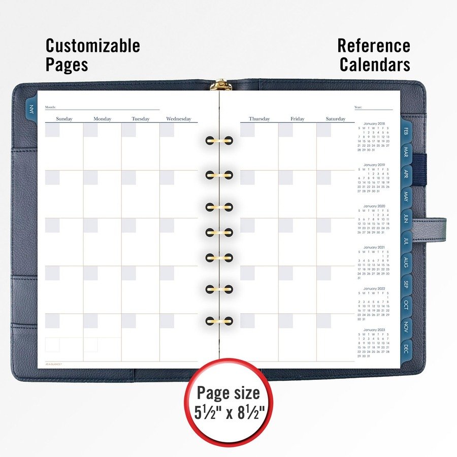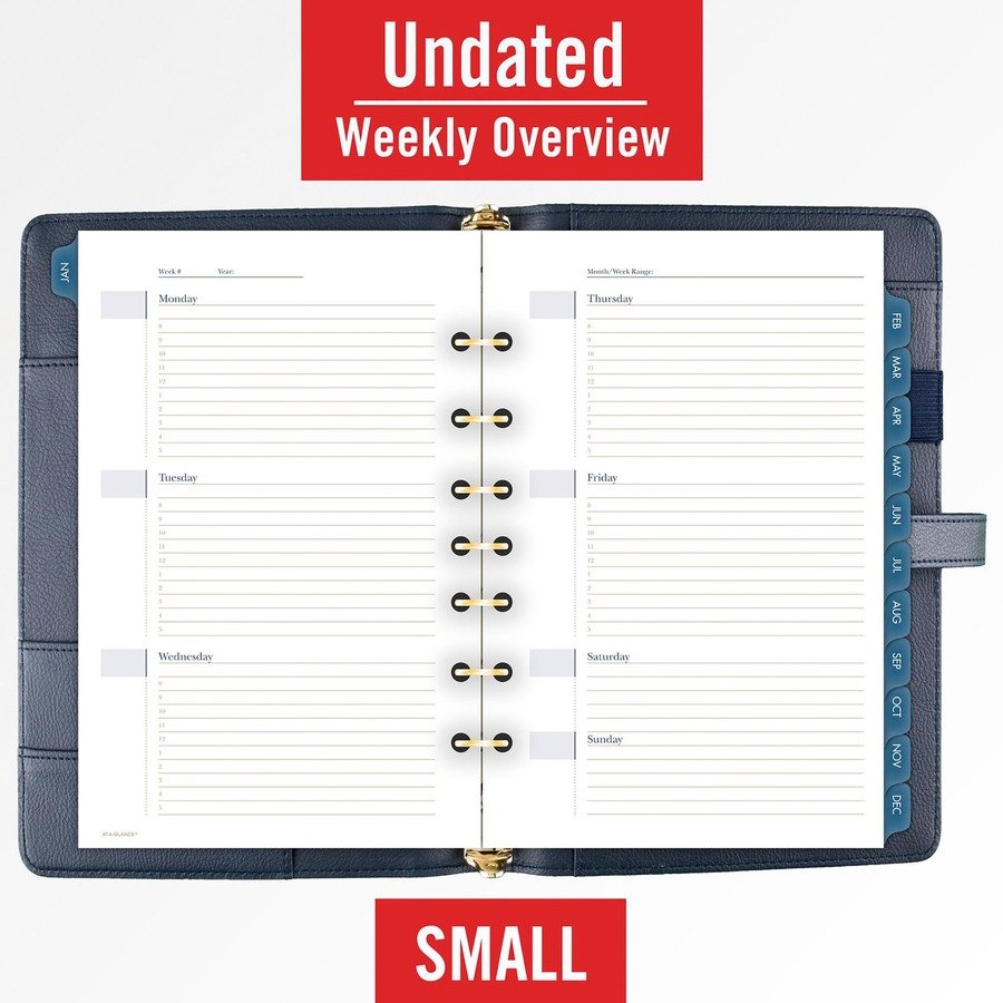 Undated starter set features luxurious and fashionable, faux-leather covers with an exterior zipper pocket and a buckle closure. To set up your planning any time, take advantage of the set that includes an undated 12-month tab set, 16 undated weekly pages and 24 notes pages. Two-page-per-week spreads offer ruled planning space with hourly appointment times from 8 AM to 5 PM. Two-page-per-month spreads have open daily blocks with a shaded area to write in the date plus space at the top to write in the month and year. Each month is tabbed, and future year reference calendars are displayed. Organizing pockets inside the cover provide additional storage. Cover also comes with an elastic pen loop. Starter set accessories include a zippered pouch, page marker ruler and 24-sheet notepad. Organizer cover is binder style with seven rings (3/4″) so pages stay secure. Desk size starter set (size 4) comes with 5-1/2″ x 8-1/2″ pages.