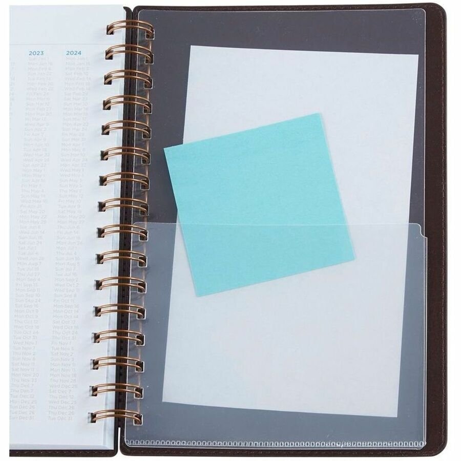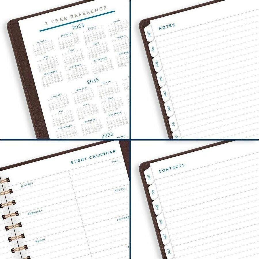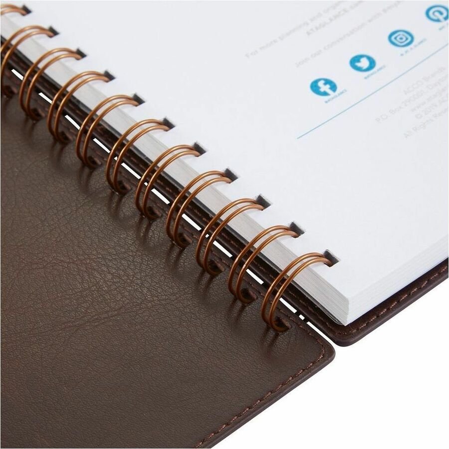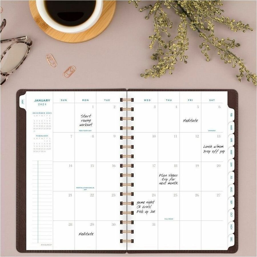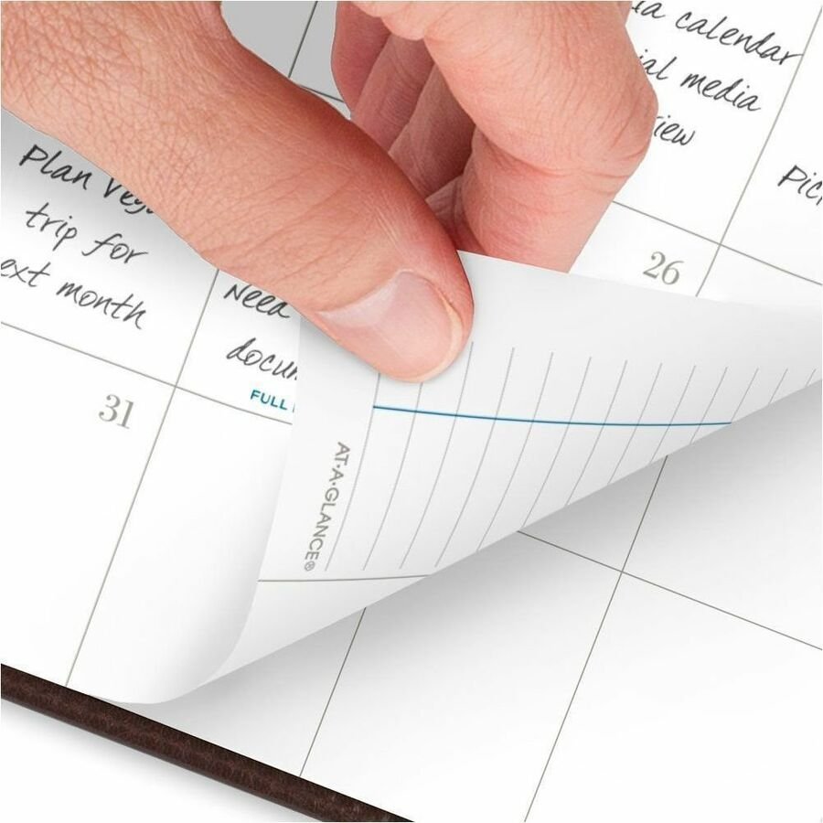 Part of the At-A-Glance Signature Collection, this stylish planner features a soft, brown leatherlike cover with stitched edges and bronze accents for a polished look. High-quality paper features superior ink bleed-resistance. Planning pages range 13 months from January to January. They include weekly and monthly spreads to help you keep track of tasks and events all year long. Two-page-per-week spreads include ruled daily blocks. Monday through Thursday run across the top of the spread, and Friday through Sunday are shown across the bottom with extra space for notes. Two-page-per-month spreads feature unruled daily blocks for open scheduling, ruled notes column and past/future months reference to check dates as you plan. Each month is tabbed for easy navigation. Special pages are easy to reference as you plan and include a holiday listing, three-year reference calendars, event calendar, contact pages and notes pages. Double-sided clear pocket stores loose sheets.