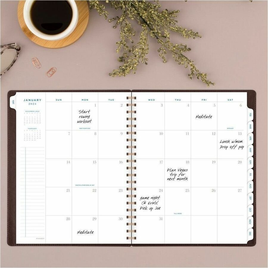 Part of the At-A-Glance Signature Collection, this sleek, stylish planner features a soft leatherlike cover with stitched edges for a polished look. High-quality paper features superior ink bleed-resistance. Planning pages range 13 months from January to January. They include weekly and monthly spreads to help you keep track of tasks and events all year long. Two-page-per-week spreads include ruled daily blocks. Monday through Thursday run across the top of the spread, and Friday through Sunday are shown across the bottom with extra space for notes. Two-page-per-month spreads feature unruled daily blocks for open scheduling, ruled notes column and past/future months reference to check dates as you plan. Each month is tabbed for easy navigation. Special pages are easy to reference as you plan and include a holiday listing, three-year reference calendars, event calendar, contact pages and notes pages. Double-sided clear pocket stores loose sheets.