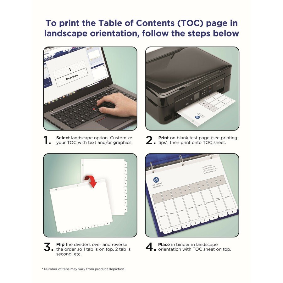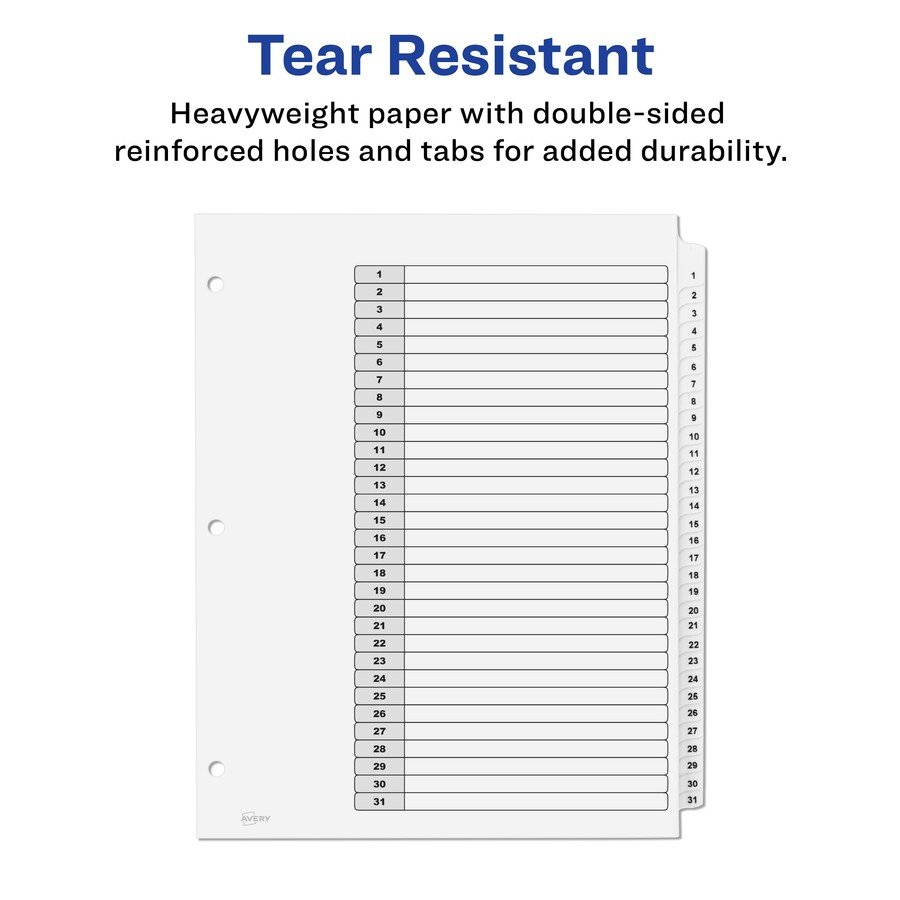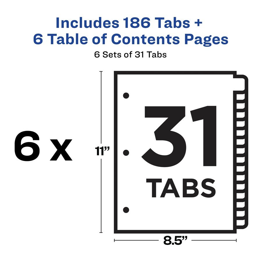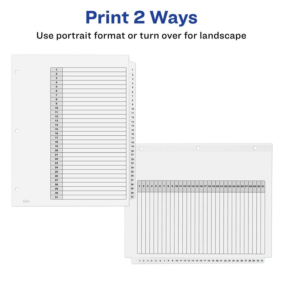 Organize your documents quickly and easily using these Ready Index Dividers with customizable table of contents. No tab inserts or labels are needed. Double-sided section title page and tab dividers provide the flexibility to use the dividers in either a portrait or landscape format. White tabs feature the numbers 1 through 31 preprinted in black for easy access. Heavyweight paper, double-sided reinforced holes and extended tab reinforcements provide added durability. Dividers are great for project binders, meeting materials, reference or training manuals, archiving and more. Easily customize your table of contents page with a logo, name, date or project title using free online templates and designs.
