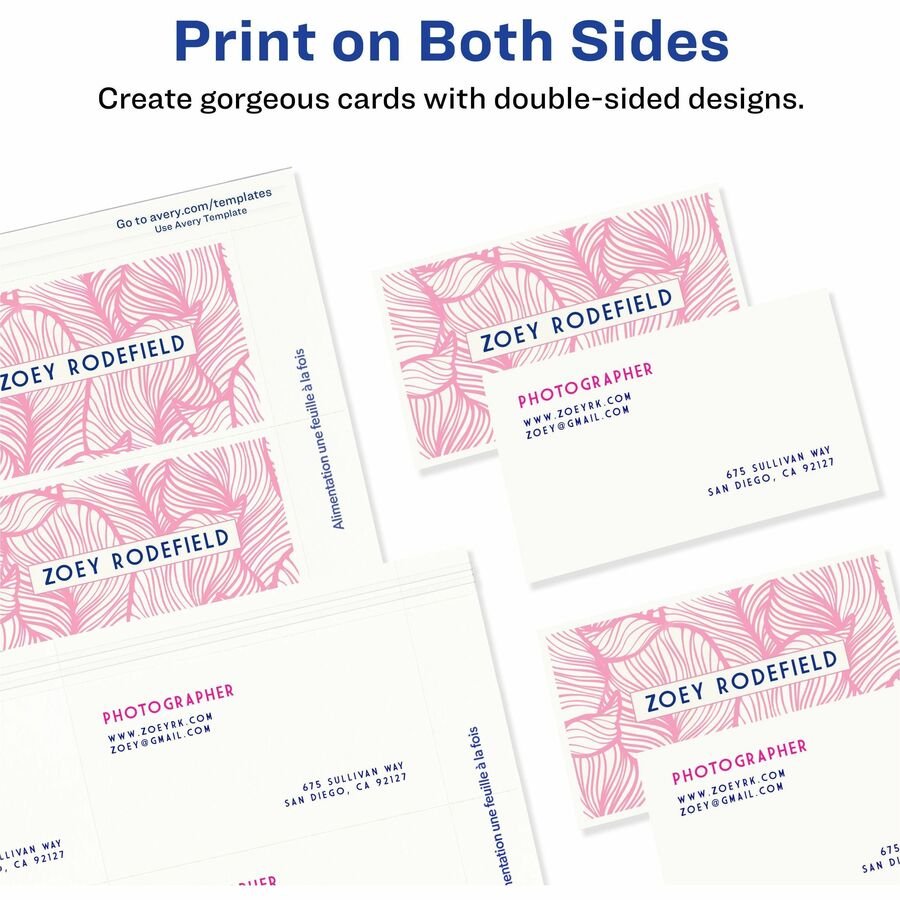 Marketing Information:Create custom business cards with no perforations. Unique patented design eliminates the look of perforated edges. Cards snap apart for easy separation with clean, smooth edges. High-quality, heavyweight cardstock is designed for use in most laser printers. Print rich graphics and clean text on both sides to expand exposure to your goods and services. Avery offers many easy-to-use templates for Microsoft Word and other popular software programs.