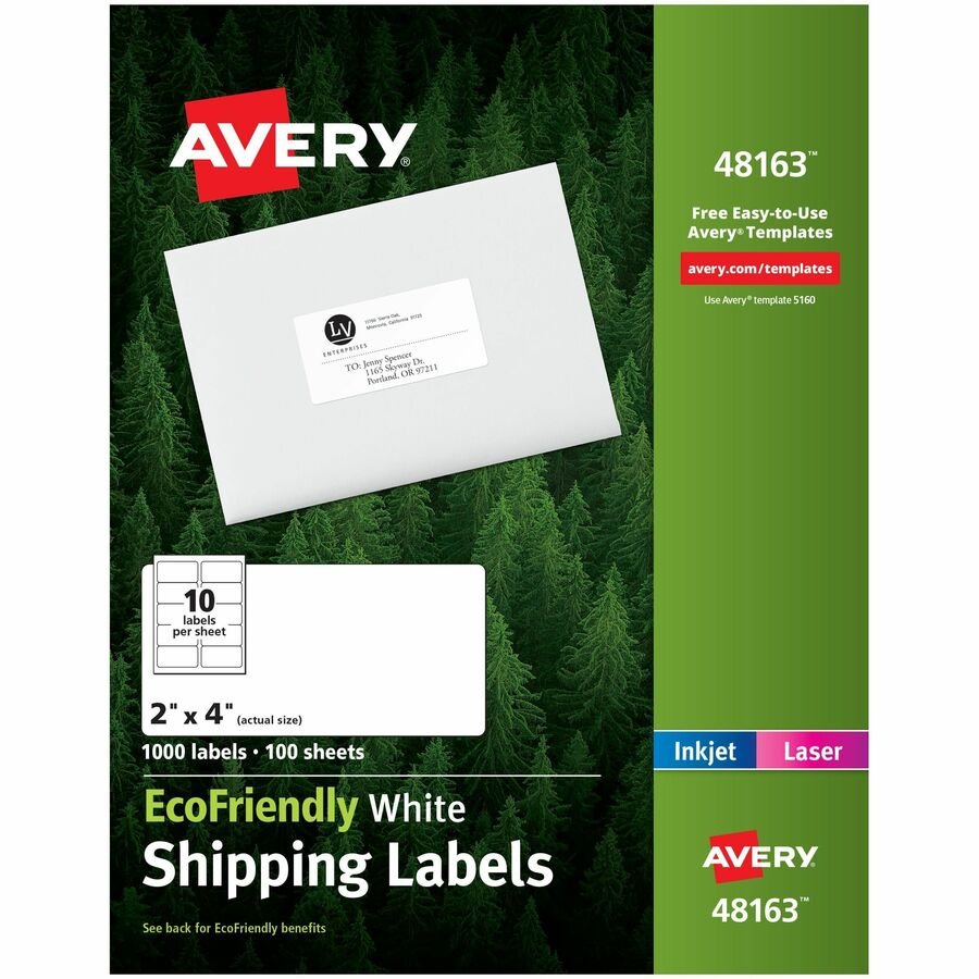 Marketing Information:Mailing labels offer eco-friendly labeling. The label paper and package are made with a high percentage of recycled material and with a chlorine-free process that cuts down the amount of harmful substances associated with the manufacturing process. The labels and box are printed on soy-based and vegetable-based inks that come from renewable materials, rather than solvent-based inks. When you’re done, the labels and box are also recyclable. Avery offers many free, easy-to-use design and print solutions for labels. Labels are compatible with laser and inkjet printers.