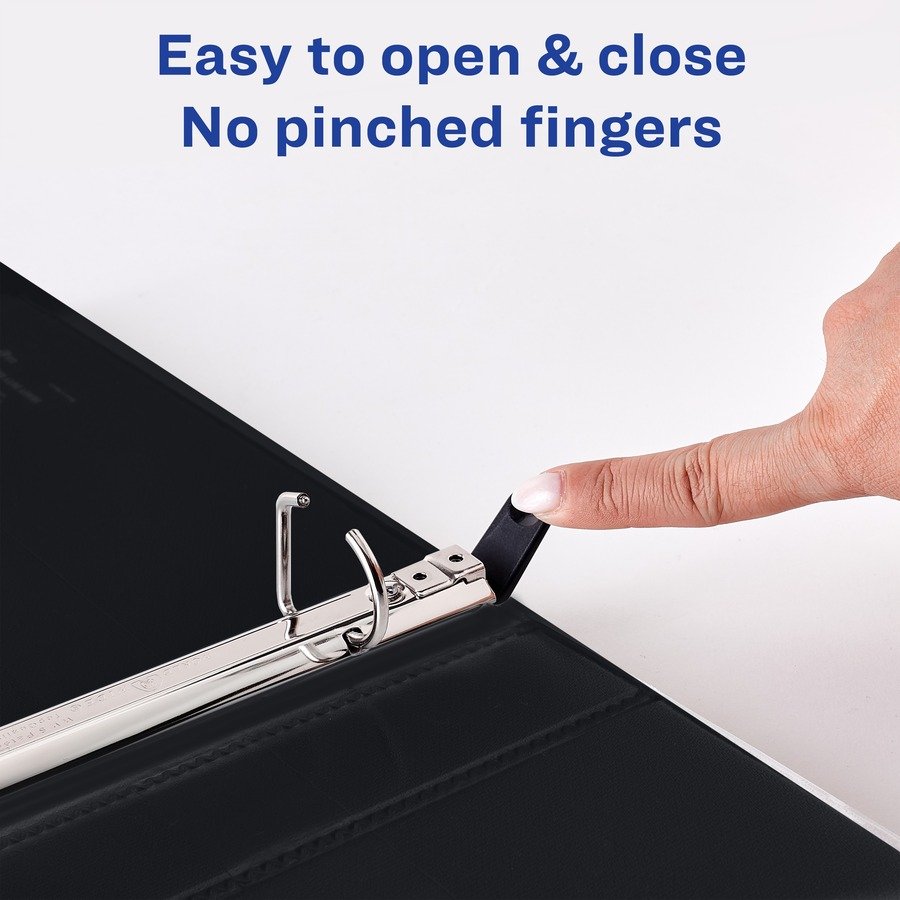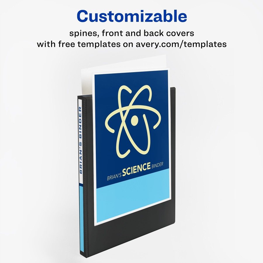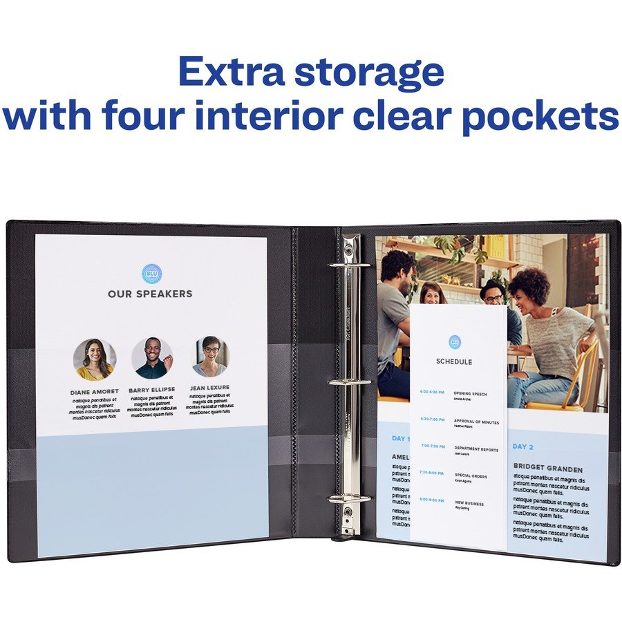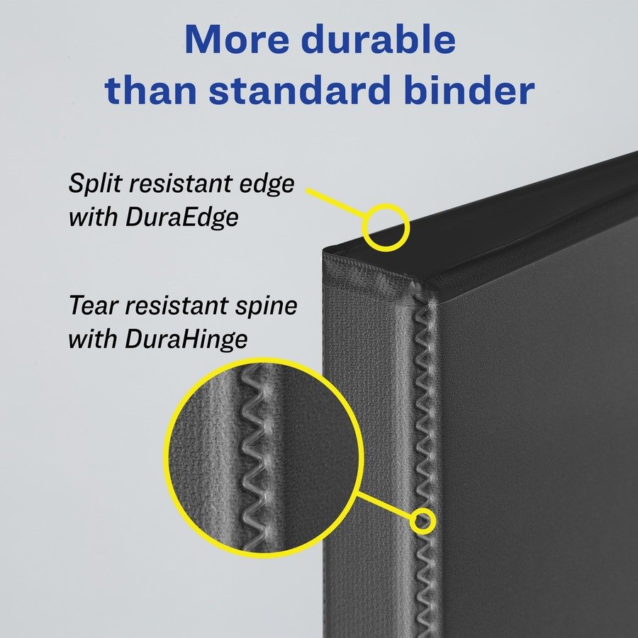 Marketing Information:Heavy-Duty View Binder is built for extended use. DuraHinge design is stronger, lasts longer and resists tearing. The DuraEdge feature makes the sides and top more pliable to resist splitting. Deep-texture film offers a smoother finish and features a linen pattern for a high-quality look and feel. Clear cover and spine allow easy customization. The 1/2″ capacity of the slant rings holds up to 120 pages. Four interior pockets provide extra storage. Wider front and back panels fully cover standard dividers and sheet protectors. One-touch slant rings open and close with ease and keep pages secure. Slant rings have a higher page capacity than same-size round rings, and pages lie flat with back-mounted rings. Binder holds letter-size documents.