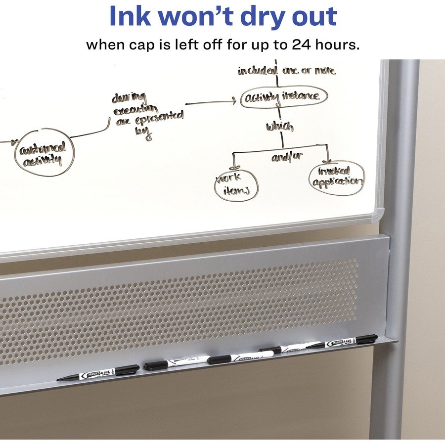 Marketing Information:Bold, erasable ink of these Marks A Lot Dry Erase Markers provides high visibility even from a distance. They write smoothly on whiteboards, glass and other nonporous surfaces. Ink wipes off easily with a dry cloth or eraser. The cap can be left off for up to 24 hours without the ink drying out. Bullet tip is great for creating clean lines in tight spaces. Nontoxic, low-odor ink makes them great for school, office and home,