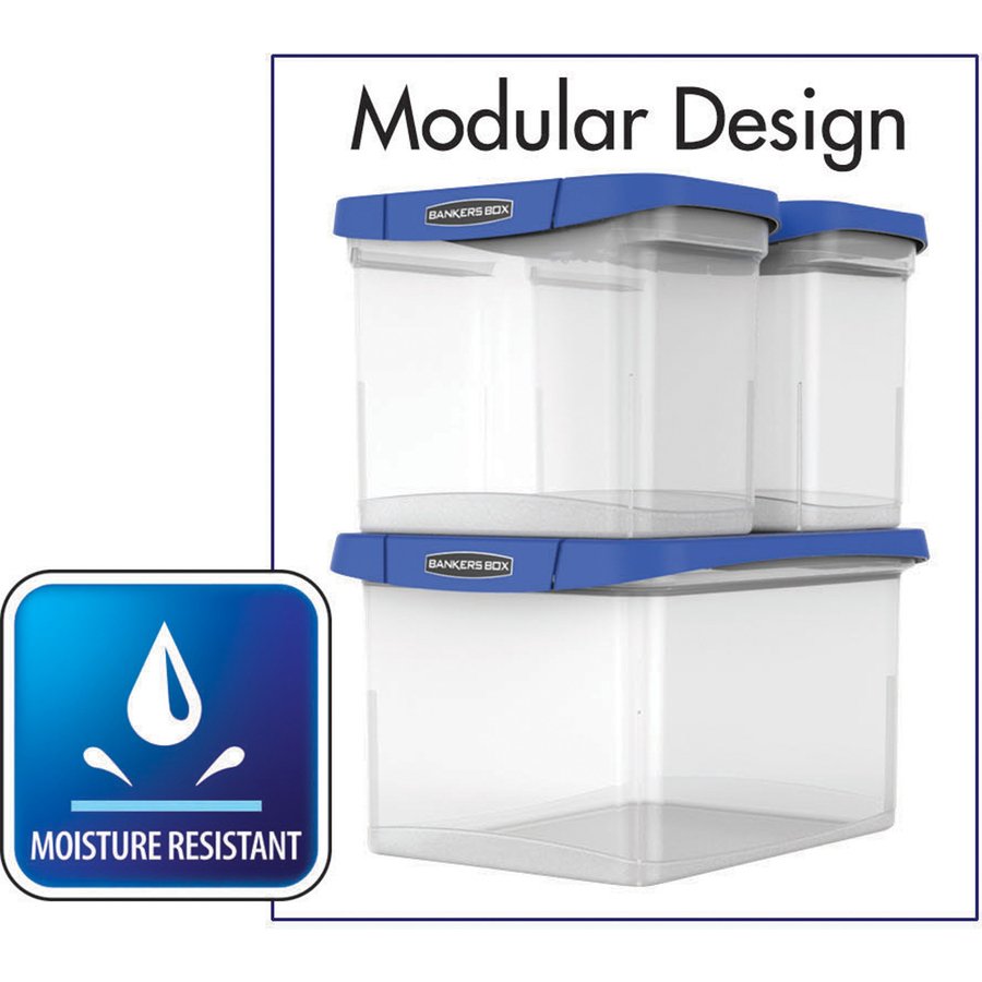 Bankers Box Heavy-duty File Box provides organized and secure, waterproof storage of letter-size and legal-size documents. Durable plastic (polypropylene) construction features reinforced corners for added strength so the file box can stack up to five high. Modular design of the TAA-compliant file box means easy stackability. Comfortable handles allow easy lifting. Locking lid ensures secure transport. Built-in hanging rail keeps files organized and accessible. Inside dimensions are 11-3/4″ x 14-1/2″ x 10-3/8″.