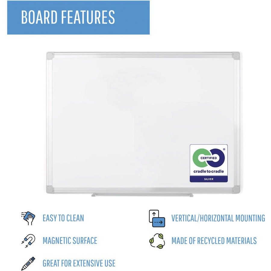 Dry-erase board features an exceptionally smooth writing surface that resists ghosting to keep its bright appearance through years of use. Magnetic backing allows you to instantly post messages or attach your magnetic accessories. Four-corner mounting system can be positioned either vertically or horizontally to provide versatility when reconfiguring an office or where wall space is limited. Pen tray offers a convenient way to keep your writing utensils within quick reach. 36″ x 48″ dry-erase board is perfect for classrooms, offices, training environments, meeting rooms and more.
