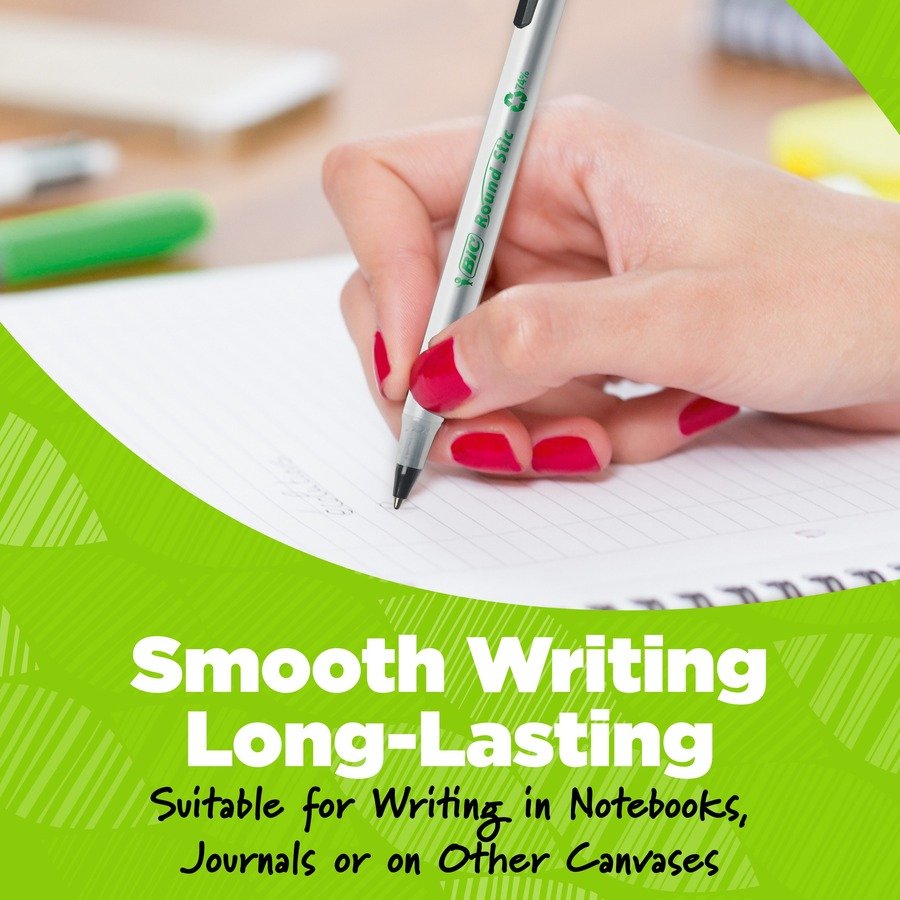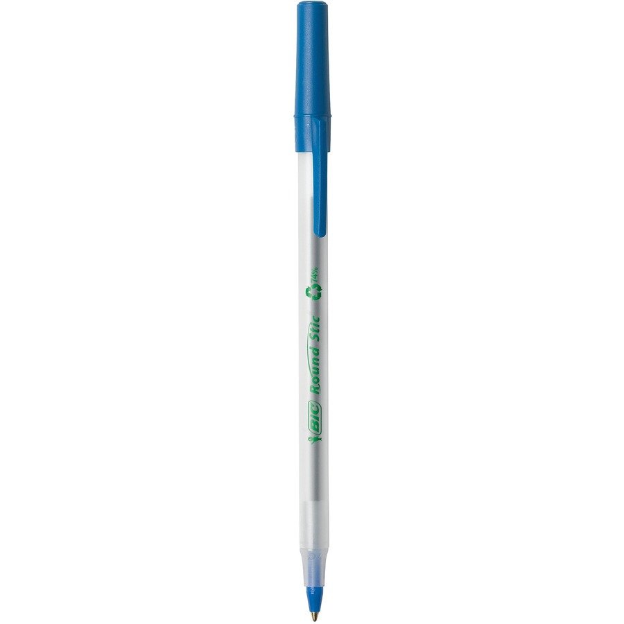 Marketing Information:Help write our planet’s future with the long-lasting BIC Ecolutions Round Stic Ballpoint Pens. This ball pen is not only made from 97% recycled plastic excluding ink cartridge, but the paperboard used in the packaging is made up of 100% recycled content and is also recyclable. With a medium 1.0 mm ballpoint, it’s the perfect BIC pen for everyday writing. The smooth writing ink system delivers hours of effortless writing – this pen is proven to write 90% longer on average than PaperMate InkJoy 100 Stick Ball Pen(1). A classic, slender, semi-clear barrel acts as a handy window when checking pen ink levels. These blue ink pens are suitable for righties and lefties, as the blue ink dries quickly to prevent smearing. Use the convenient clip to hook the ink pen onto your pocket or notebook. Looking for larger quantities of office or school supplies? Choose these bulk pens, which contain 50 blue pens. Pick up BIC Ecolutions Round Stic Ballpoint Pen for a high-quality, affordable writing utensil you can trust. (1)PaperMate and InkJoy are trademarks of Newell or an affiliate. Newell has not sponsored or approved and is not affiliated with this BIC branded product.