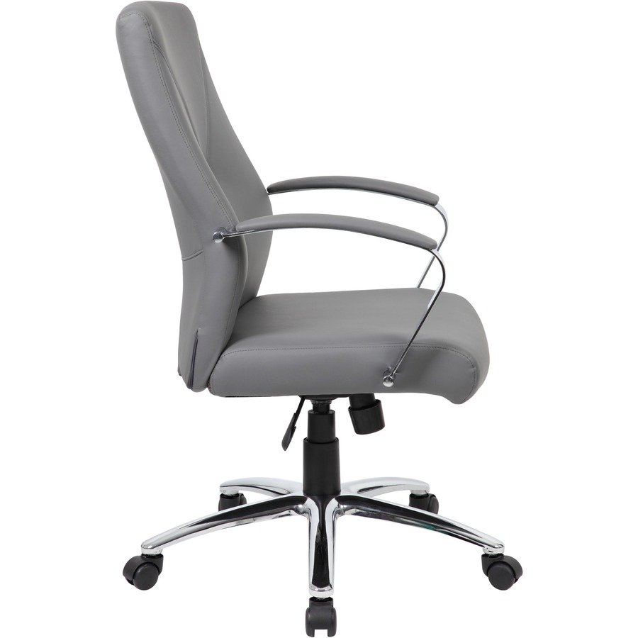 This luxurious chair is upholstered with LeatherPlus to give you extra softness, more pliability and durability. Delicate stitching on the back of the chair adds a flair of style to an already comfortable and attractive chair. Soft padding over the chrome-plated, metal arms offers gentle support for your arms. Adjustable tilt tension control and upright locking position help you position yourself exactly where you want. The pneumatic gas lift allows you to modify your height in relation to your worksurface for increased comfort and ergonomic benefit. 27″ chrome base with double-wheel casters offers greater stability. Executive chair supports up to 275 lb.