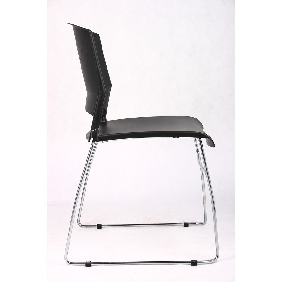 Stylish, black Stack Chairs are made of polypropylene for superior durability and lumbar support. Chairs feature solid, chrome frames and sculpted backs with an integrated opening for enhanced mobility and stacking. Stack up to 16 chairs on Boss D100 Dolly (not included) or five on the floor to save storage space. Boss Ganging Clamps (not included) are available to attach multiple units together at the bottom of the leg.