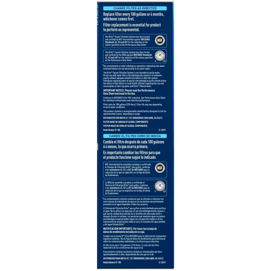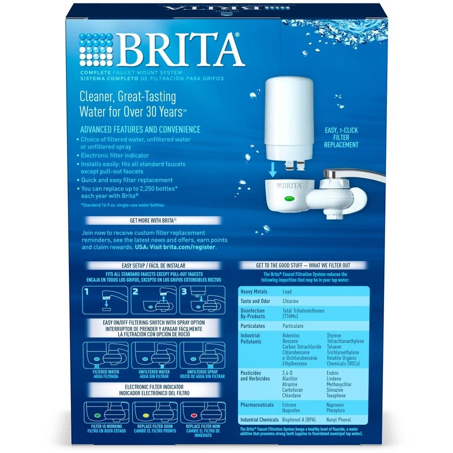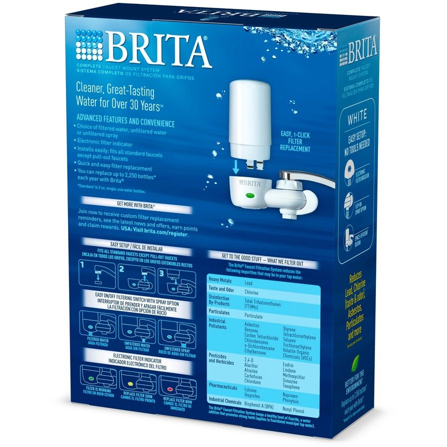 Brita Complete On Tap Faucet Water Filtration System with a sleek finish filters out odors and impurities for healthier, great-tasting water. This complete faucet mount removes 99 percent of lead and reduces chlorine (taste and odor) and asbestos contaminants commonly found in tap water. An extra layer in the system traps sediments and smaller contaminates. One Brita water filter can provide up to 100 gallons of filtered tap water, replacing more than 750 standard, 16.9 oz. plastic water bottles to cut down on waste and save money. This certified, Brita water filter system attaches directly to standard faucets in five easy steps for simple installation. Built-in filter indicator signals when the need for a replacement filter is required after approximately 100 gallons or four months, whichever comes first. This model does not fit pullout or spray style faucets. Get better taste on tap with the Brita White On Tap Faucet Water Filter System.