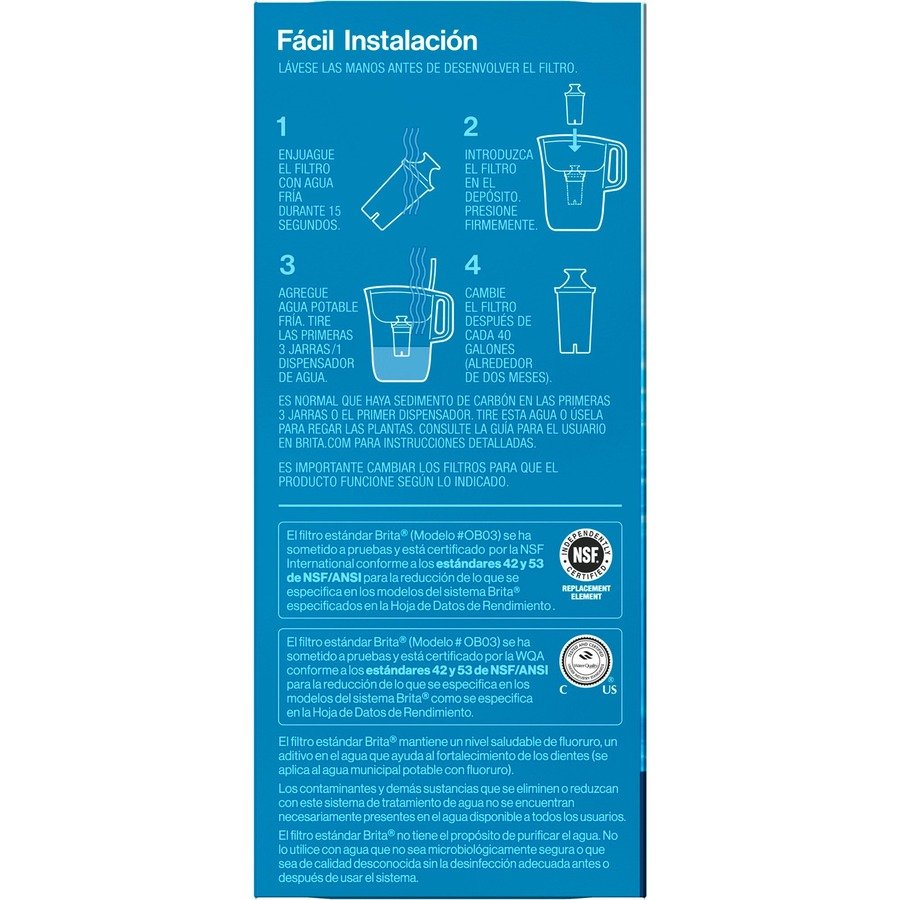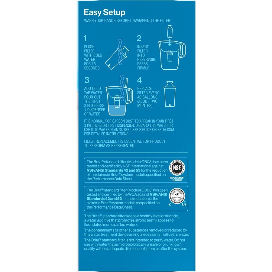 Keep tap water healthier and tasting better when you regularly change your Brita replacement filter. Made to fit all Brita pitchers and dispensers, this replacement filter reduces copper, mercury and cadmium impurities that can adversely affect your health over time while cutting chlorine taste and odor to deliver great-tasting water. Designed to leave no black flecks in your water and with no pre-soak required, the Brita filters are quick and easy to use. Change your Brita filters every 40 gallons or approximately 2 months for best performance. Brita filters are ideal for use in restaurants, cafeterias and other commercial facilities.