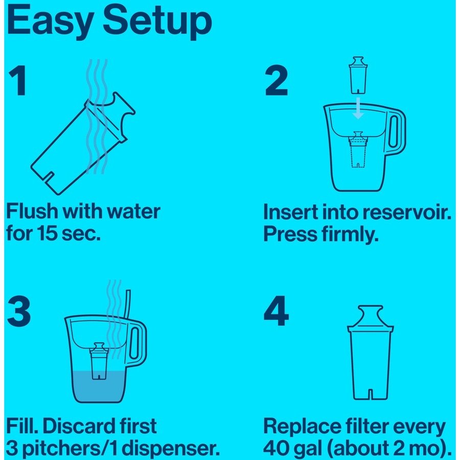 Keep tap water healthier and tasting better when you regularly change your Brita replacement filter. Made to fit all Brita pitchers and dispensers, this replacement filter reduces copper, mercury and cadmium impurities that can adversely affect your health over time while cutting chlorine taste and odor to deliver great-tasting water. Designed to leave no black flecks in your water and with no pre-soak required, the Brita filters are quick and easy to use. Change your Brita filters every 40 gallons or approximately 2 months for best performance. Brita filters are ideal for use in restaurants, cafeterias and other commercial facilities.