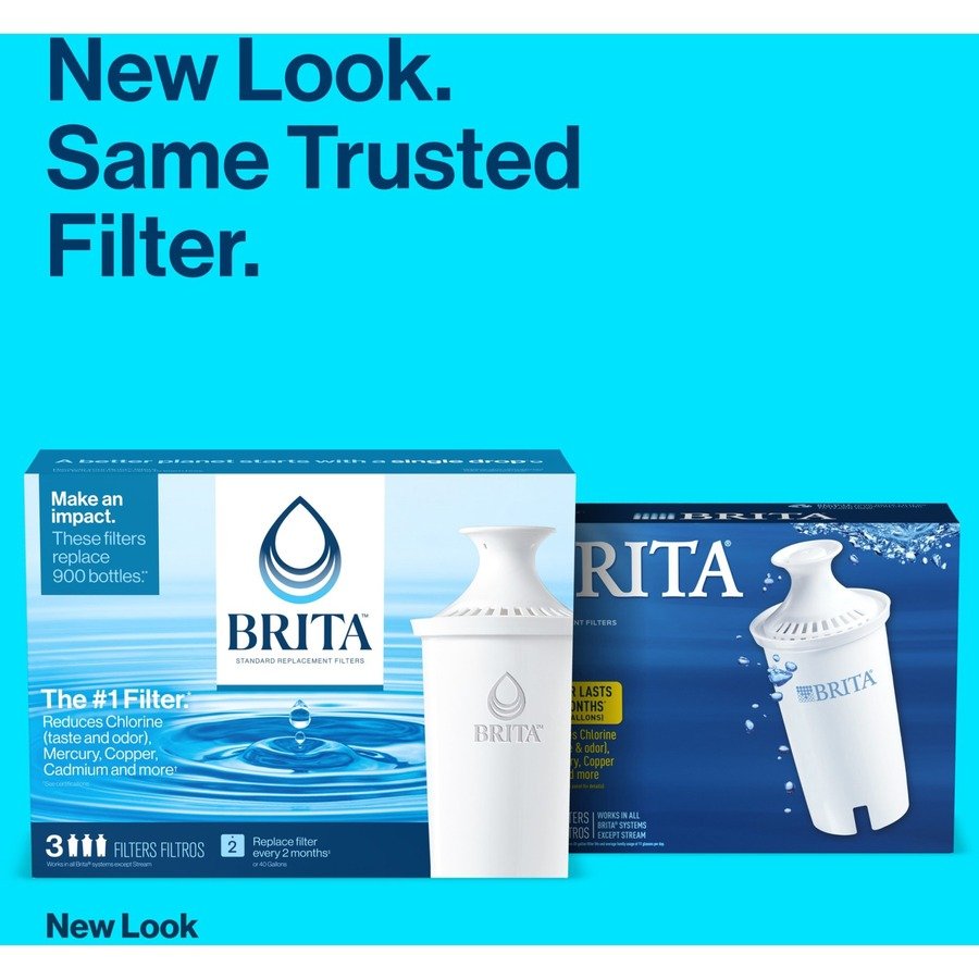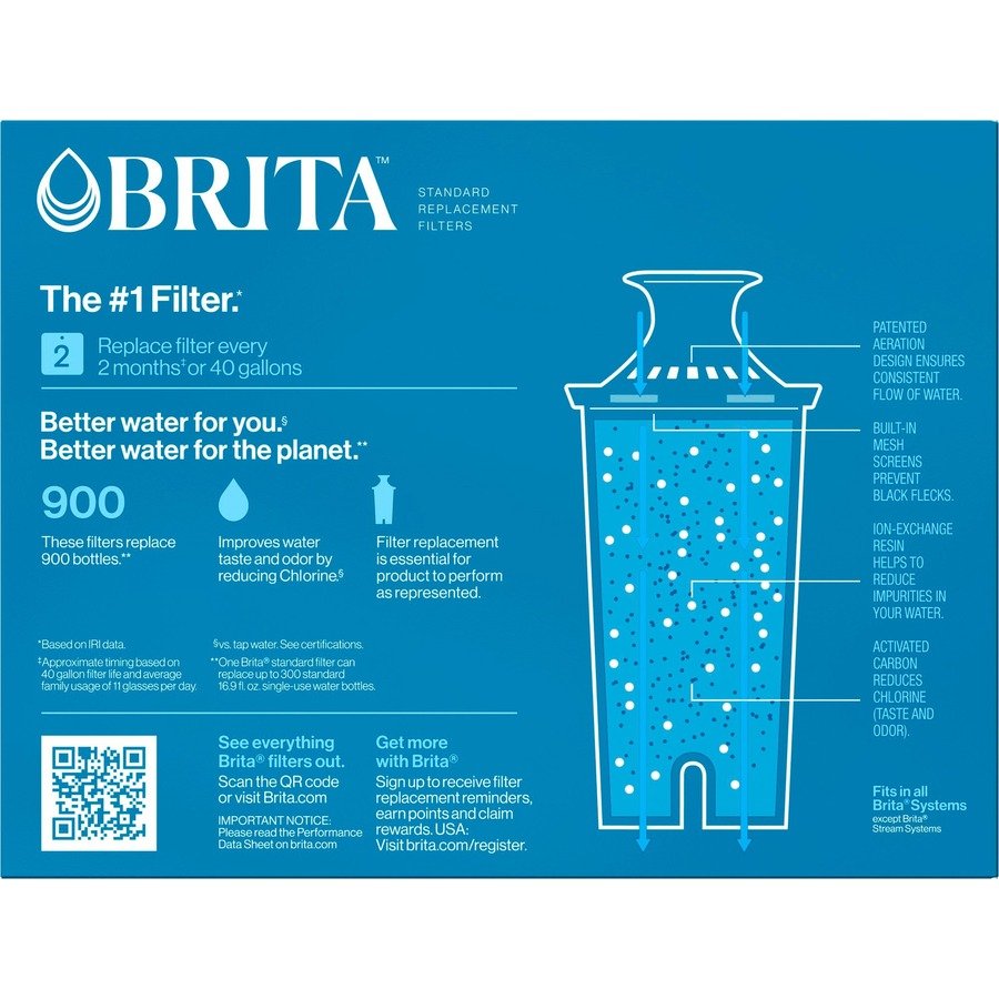 Keep tap water healthier and tasting better when you regularly change your Brita replacement filter. Made to fit all Brita pitchers and dispensers, this replacement filter reduces copper, mercury and cadmium impurities that can adversely affect your health over time while cutting chlorine taste and odor to deliver great-tasting water. Designed to leave no black flecks in your water and with no pre-soak required, the Brita filters are quick and easy to use. Change your Brita filters every 40 gallons or approximately 2 months for best performance. Brita filters are ideal for use in restaurants, cafeterias and other commercial facilities.