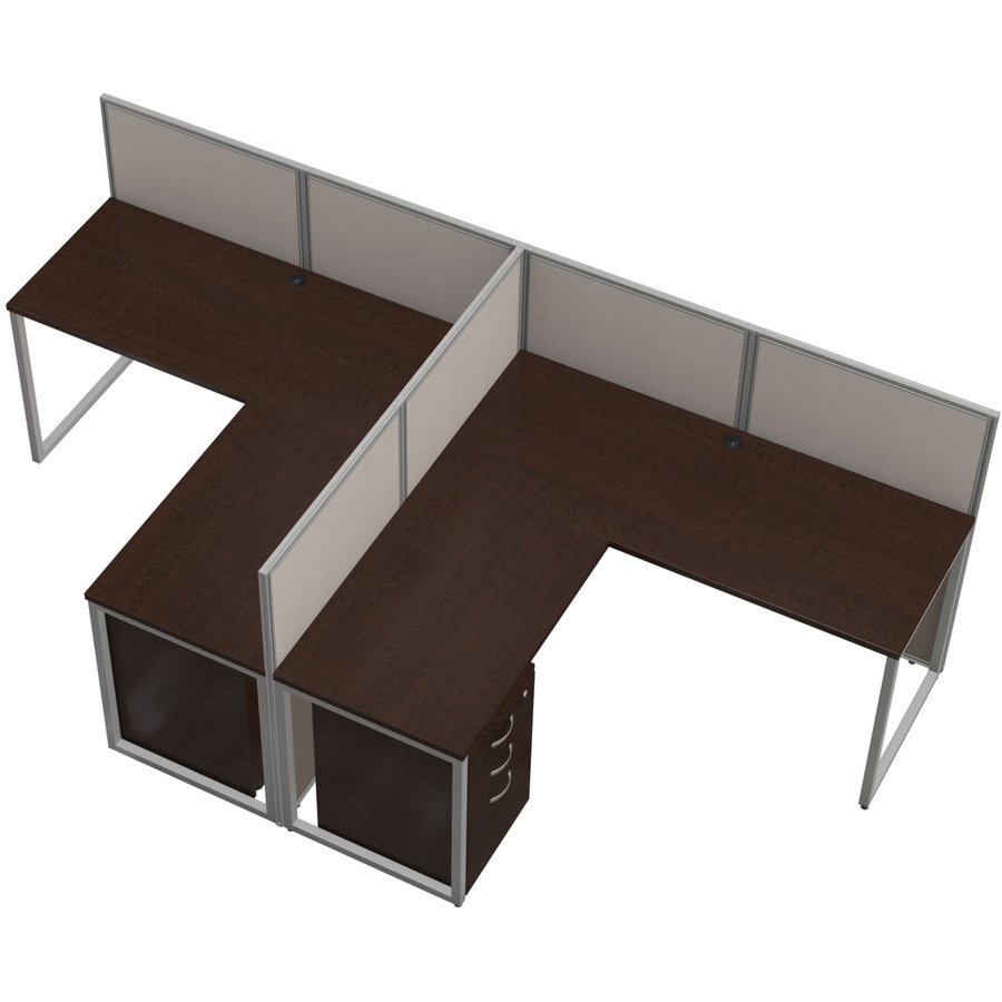 The 60″ wide 2-Person L-Desk Open Office with three-drawer pedestals and 45″ high panels let you maximize floor space by combining individual work areas with a common panel wall. Two 60″ wide x 24″ deep Straight Office Desks, two 36″ wide x 24″ returns, two 16″ wide pedestals and set of two 60″ wide x 45″ high Cubicle Panels with corner connectors are part of the stylish, Easy Office collection designed for fast assembly with pre-installed connectors. Thermally fused, laminate worksurface features superior resistance to scratches and stains while providing a wire-management grommet to keep cords organized. Desks attach to sturdy, 45″ high wall panels that foster team collaboration. Configure to the left or right. Fabric-upholstered panels come in a durable, Light Gray and Storm Gray, two-toned fabric that complements the rich warmth of the Mocha Cherry worksurface. Commercial construction meets ANSI/BIFMA standards for safety and performance.