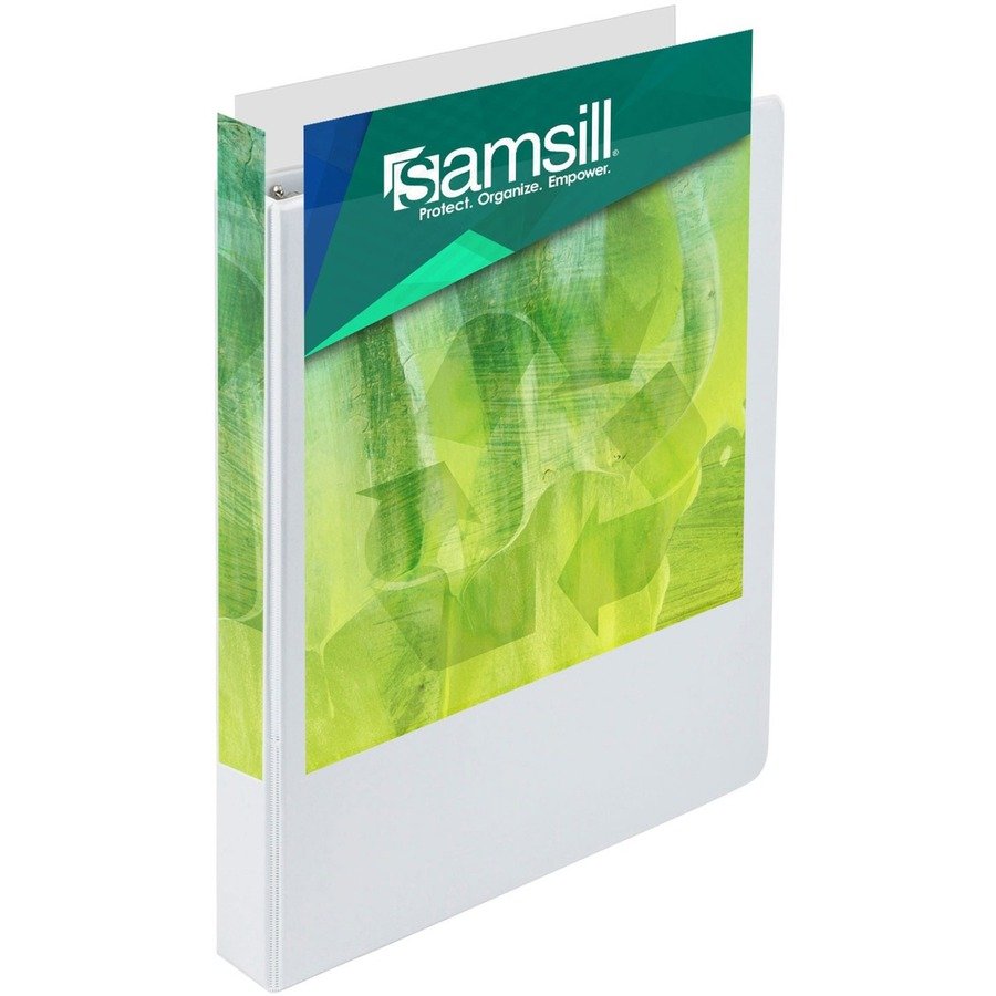 Round-ring view binder offers crystal-clear, nonglare overlays to customize the covers and spine for your letter-size presentations. Back-mounted metal rings allow pages to lie flat. 3″ capacity holds up to 625 sheets. Clear pockets on the inside covers offer extra document storage with a 30-sheet capacity for each pocket. Design also features a sturdy chipboard core and exposed rivets. Binder is made of polypropylene for durability and resilience.