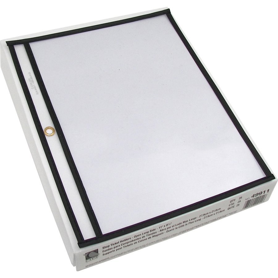 Store and protect work orders, production schedules, inventory cards and more in these stitched shop ticket holders. Use the convenient metal eyelet at top for hanging. Strong, rigid, clear vinyl allows easy visibility of documents on both sides. Reinforced stitched edge prolongs product life. Holders open on the long side.