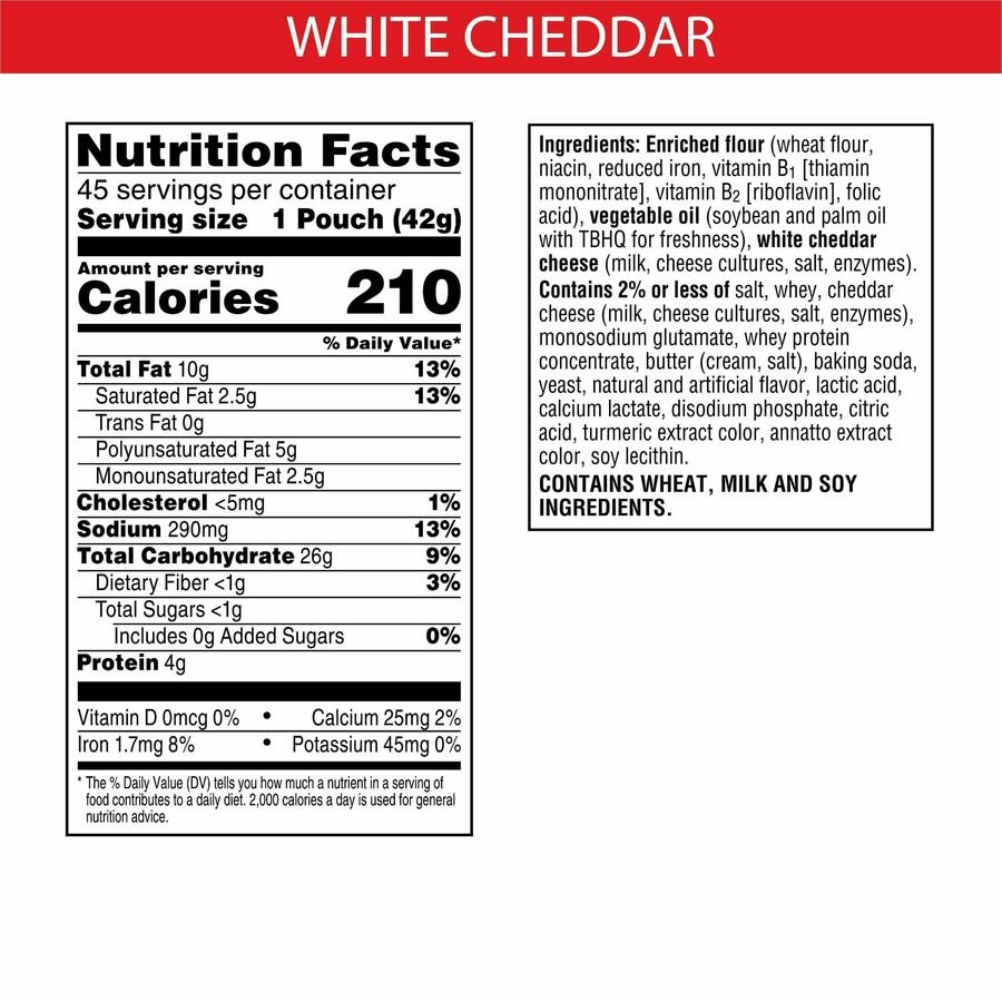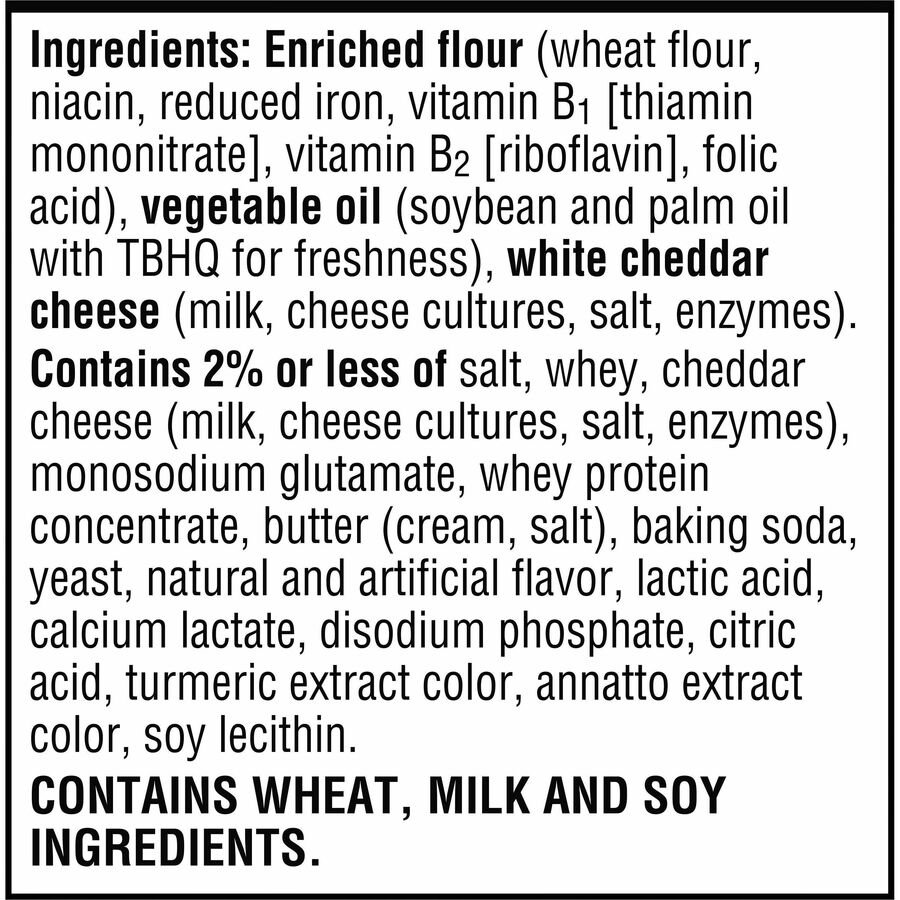 Ingredients:Enriched Flour (Wheat Flour, Niacin, Reduced Iron, Thiamin Mononitrate [Vitamin B1], Riboflavin [Vitamin B2], Folic Acid), Vegetable Oil (Soybean And Palm Oil With Tbhq For Freshness), White Cheddar And Cheddar Cheese (Milk, Cheese Cultures, Salt, Enzymes), Contains Two Percent Or Less of Salt, Whey, Maltodextrin, Monosodium Glutamate, Leavening (Yeast, Baking Soda), Whey Protein Concentrate, Butter (Cream, Salt), Natural And Artificial Flavor, Lactic Acid, Calcium Lactate, Citric Acid, Disodium Phosphate, Turmeric Extract For Color, Annatto Extract For Color, Soy Lecithin, Wheat, Milk And Soy Ingredients.