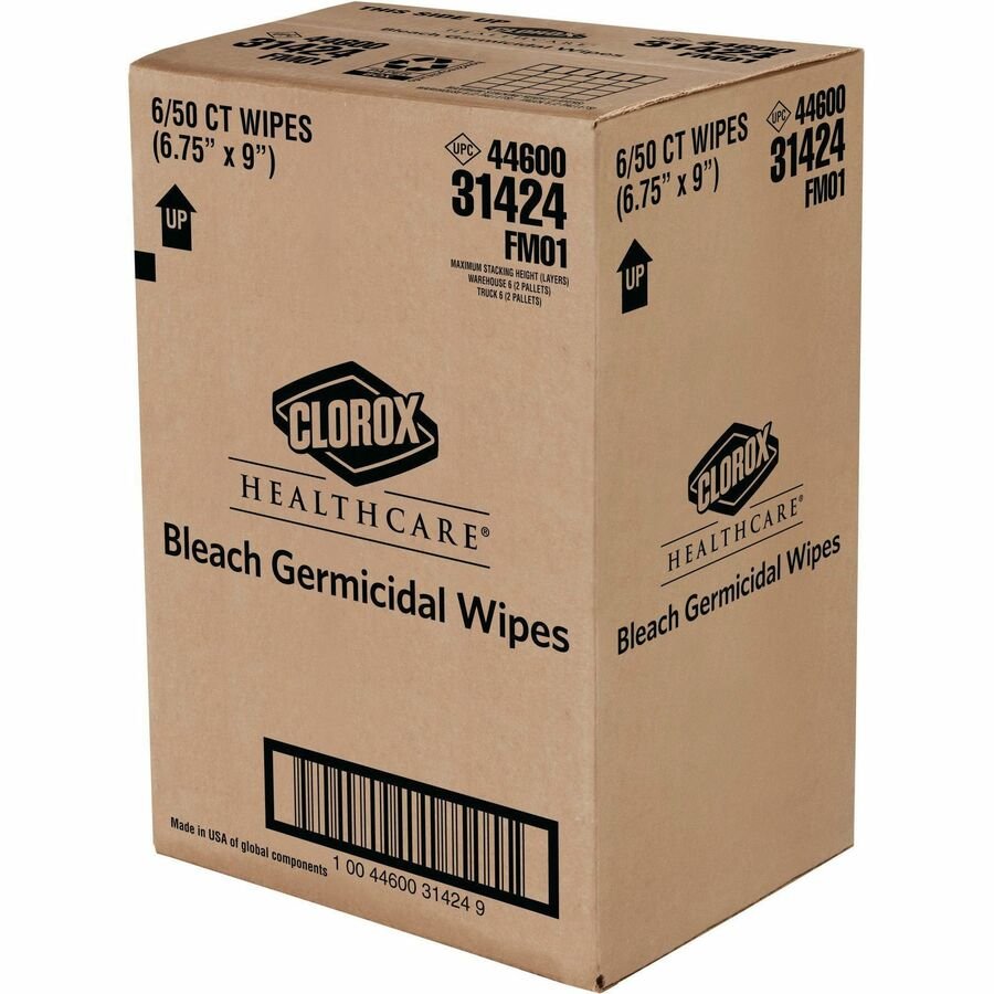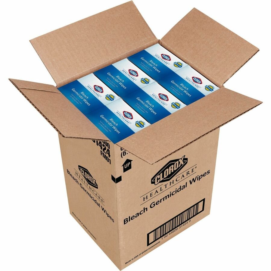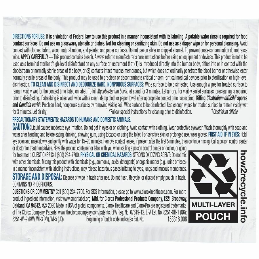 Clorox Healthcare Bleach Germicidal Wipes are ready-to-use, one-step cleaner containing a 1:10 bleach dilution to meet CDC and OSHA guidelines for disinfecting surfaces in healthcare settings. Designed for discharge disinfection, large areas. These terminal wipes are EPA-registered to kill a total of 58 microorganisms, including HAI-causing bacteria like MRSA and VRE in 30 seconds, outbreak-causing viruses such as Influenza A and B viruses, Measles Virus and Norovirus in 1 minute and C. difficile spores, TB and fungi in 3 minutes. They meet EPA criteria for use against SARS-CoV-2, the virus that causes COVID-19. These wipes are engineered minimize residue and leave less visible residue on surfaces vs. competitor bleach wipes. Wipes are formulated with an anticorrosion agent and are compatible with common healthcare surfaces including stainless steel, glass, plastic, porcelain, glazed ceramic, laminated surfaces and vinyl. They are intended for use in healthcare settings.
