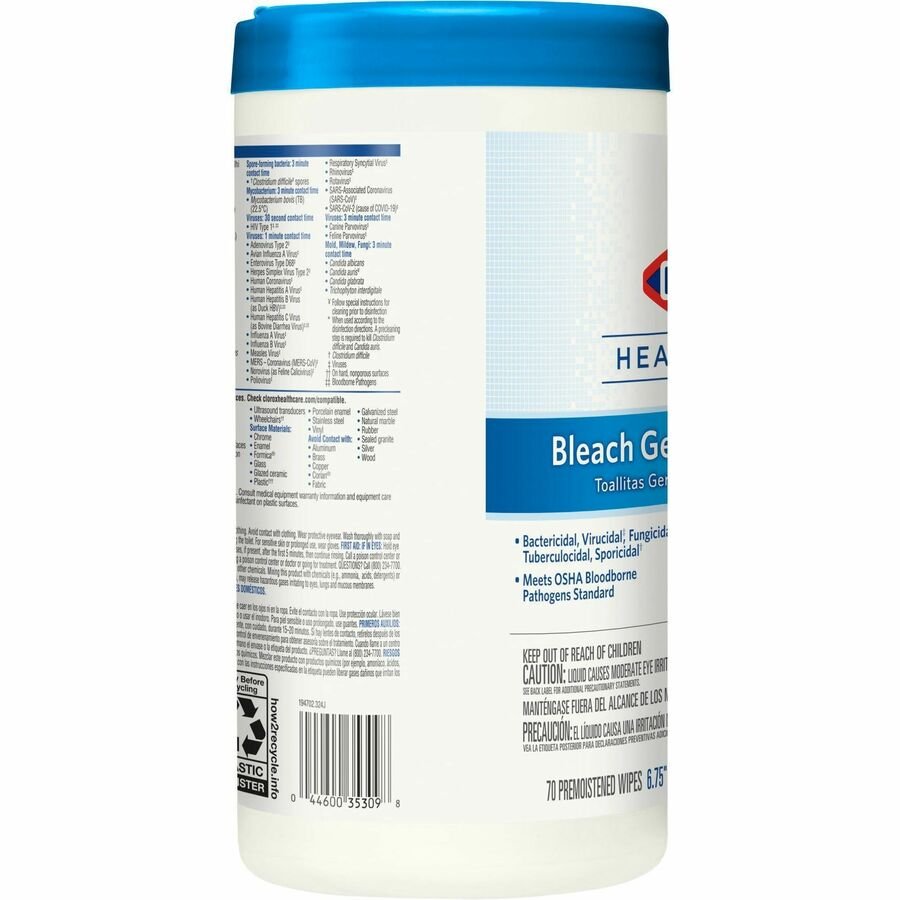 Marketing Information:Clorox Healthcare Bleach Germicidal Wipes are ready-to-use, one-step cleaner containing a 1:10 bleach dilution to meet CDC and OSHA guidelines for disinfecting surfaces in healthcare settings. Designed for discharge disinfection, large areas. These terminal wipes are EPA-registered to kill a total of 58 microorganisms, including HAI-causing bacteria like MRSA and VRE in 30 seconds, outbreak-causing viruses such as Influenza A and B viruses, Measles Virus and Norovirus in 1 minute and C. difficile spores, TB and fungi in 3 minutes. They meet EPA criteria for use against SARS-CoV-2, the virus that causes COVID-19. These wipes are engineered minimize residue and leave less visible residue on surfaces vs. competitor bleach wipes. Wipes are formulated with an anticorrosion agent and are compatible with common healthcare surfaces including stainless steel, glass, plastic, porcelain, glazed ceramic, laminated surfaces and vinyl. They are intended for use in healthcare settings.