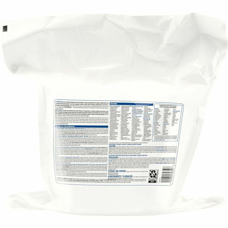 Clorox Healthcare Bleach Germicidal Wipes are ready-to-use, one-step cleaner containing a 1:10 bleach dilution to meet CDC and OSHA guidelines for disinfecting surfaces in healthcare settings. Designed for discharge disinfection, large areas. These terminal wipes are EPA-registered to kill a total of 58 microorganisms, including HAI-causing bacteria like MRSA and VRE in 30 seconds, outbreak-causing viruses such as Influenza A and B viruses, Measles Virus and Norovirus in 1 minute and C. difficile spores, TB and fungi in 3 minutes. They meet EPA criteria for use against SARS-CoV-2, the virus that causes COVID-19. These wipes are engineered minimize residue and leave less visible residue on surfaces vs. competitor bleach wipes. Wipes are formulated with an anticorrosion agent and are compatible with common healthcare surfaces including stainless steel, glass, plastic, porcelain, glazed ceramic, laminated surfaces and vinyl. They are intended for use in healthcare settings.