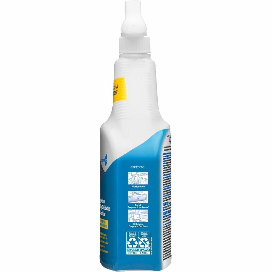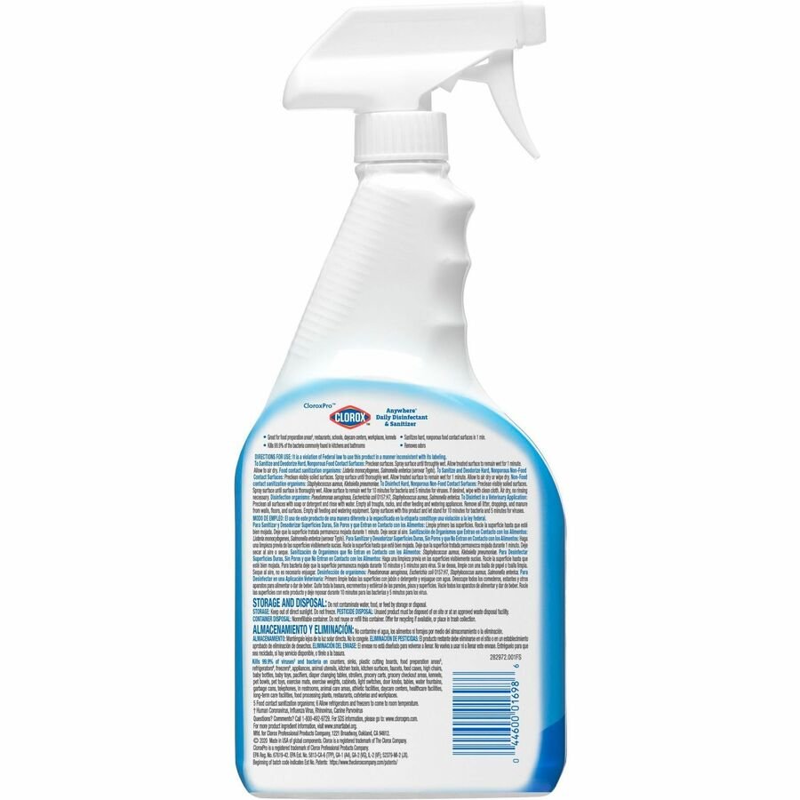Marketing Information:CloroxPro Anywhere Hard Surface Sanitizing Cleaner is designed to provide full-coverage, one-step sanitization on hard surfaces. Certified by NSF, this sanitizing cleaner kills cold and flu viruses (Human Coronavirus, Influenza Virus, Rhinovirus, Canine Parvovirus) and 99.9 percent of bacteria (Salmonella enterica, Staphylococcus aureus, E. coli) – including Coronavirus and Influenza. As a hypochlorous acid-based formula, the cleaner is tough on bacteria yet mild enough to use around children, pets and food thanks to its low odor and no residue. This sanitizing spray comes in a trigger-spray bottle and is well-suited for commercial spaces such as airports, ambulances, public restrooms, daycare centers, hotels, kennels, institutional kitchens, laundry rooms, offices and schools. Versatile, pH-balanced formula can be used on most surfaces anytime, anywhere.