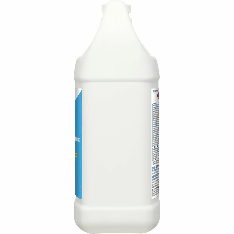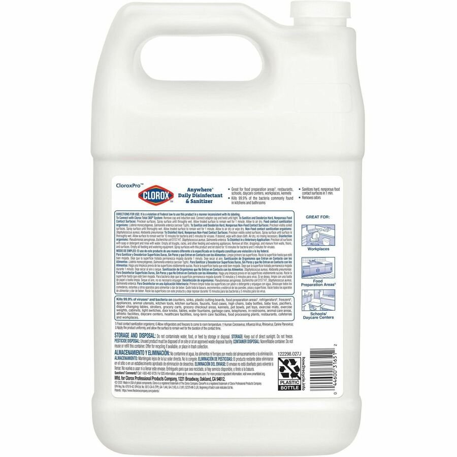 Marketing Information:CloroxPro Anywhere Daily Disinfectant and Sanitizing bottle is designed for use with the Clorox Total 360 Electrostatic Sprayer for full-coverage, one-step sanitization of daily disinfectant. Certified by NSF, this disinfectant/sanitizer kills cold and flu viruses (Human Coronavirus, Influenza Virus, Rhinovirus, Canine Parvovirus) and 99.9 percent of bacteria (Salmonella enterica, Staphylococcus aureus, Escherichia coli) with a spray that’s pH-balanced and suitable for use around people and food-contact surfaces. While the cleaner is tough on bacteria, it’s also mild enough to use around children, pets and food thanks to its low odor and no residue. It is well-suited for commercial spaces and intended for use in airports, ambulances, public restrooms, correctional facilities, laundry rooms, offices and schools. Versatile formula can be used on most surfaces anytime, anywhere. Simply spray on surfaces until thoroughly wet. Let stand for 2 minutes and air-dry – no rinsing necessary.