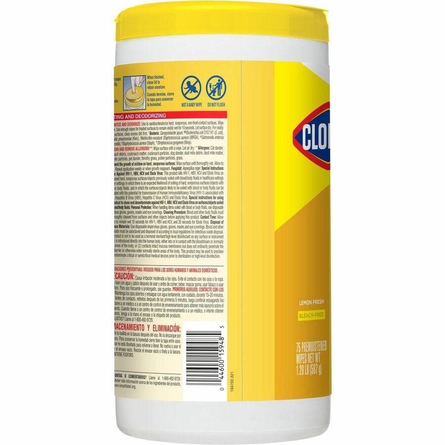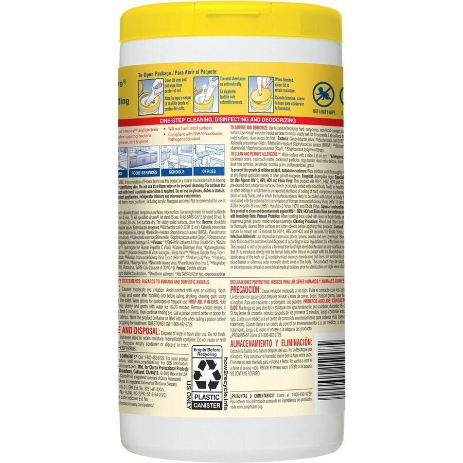 Marketing Information:Clorox Disinfecting Wipes clean and disinfect in one easy step. These sanitizing wipes are EPA-registered to kill 99.9 percent of germs including cold and flu viruses, E. coli, Salmonella, Staph, Strep, MRSA, SARS-CoV-2 and the organism that can cause whooping cough. They also remove common allergens like pet dander, pollen particles and grass. One antibacterial wipe can kill bacteria in just 10 seconds – three times faster than before. Premoistened, thick, textured wipes are perfect for spills and dirt on a variety of hard, nonporous surfaces including acrylic, glass and vinyl. They quickly clean and disinfect high-touch, germ hot spots such as doorknobs, handrails and faucets and are suitable for use on phones, keyboards and mice. Wipes are ideal for offices, daycare centers, schools, hotels, restaurants and other commercial facilities. Packaging may vary.