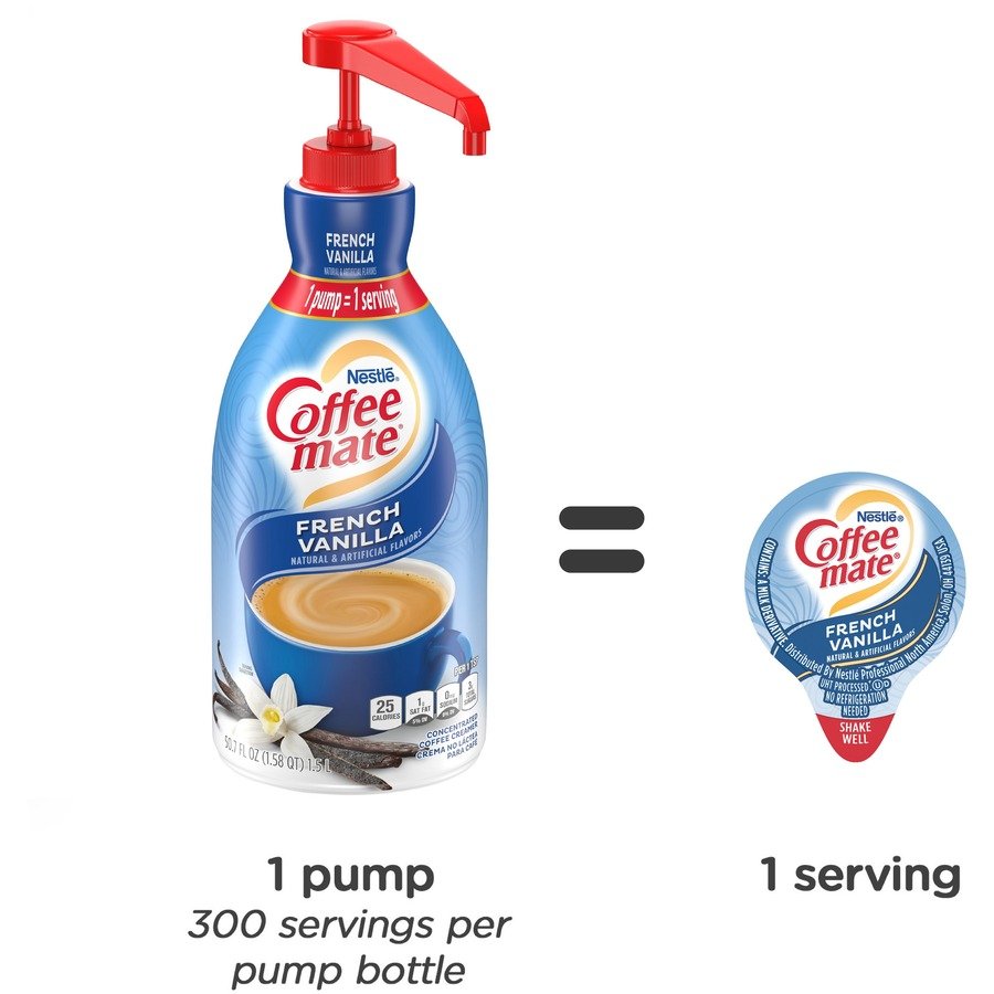 Delight your employees, customers and guests by offering Coffee mate liquid creamer in your workplace, breakroom or kitchen. Liquid pump bottle creamer adds a rich, sweetened creamy flavor to coffee beverages so everyone can enjoy coffeehouse indulgence without ever leaving the building. The 1.5 liter Coffee mate pump bottle of French Vanilla creamer delivers approximately 300 servings per bottle. One pump equals one single-serving cup of liquid creamer. Creamer offers an ambient, 30-day shelf life after opening and a nine-month shelf life before opening. Formula has sugar added to it, which makes this product shelf-stable. To ensure food safety, the pump is not removable once installed.