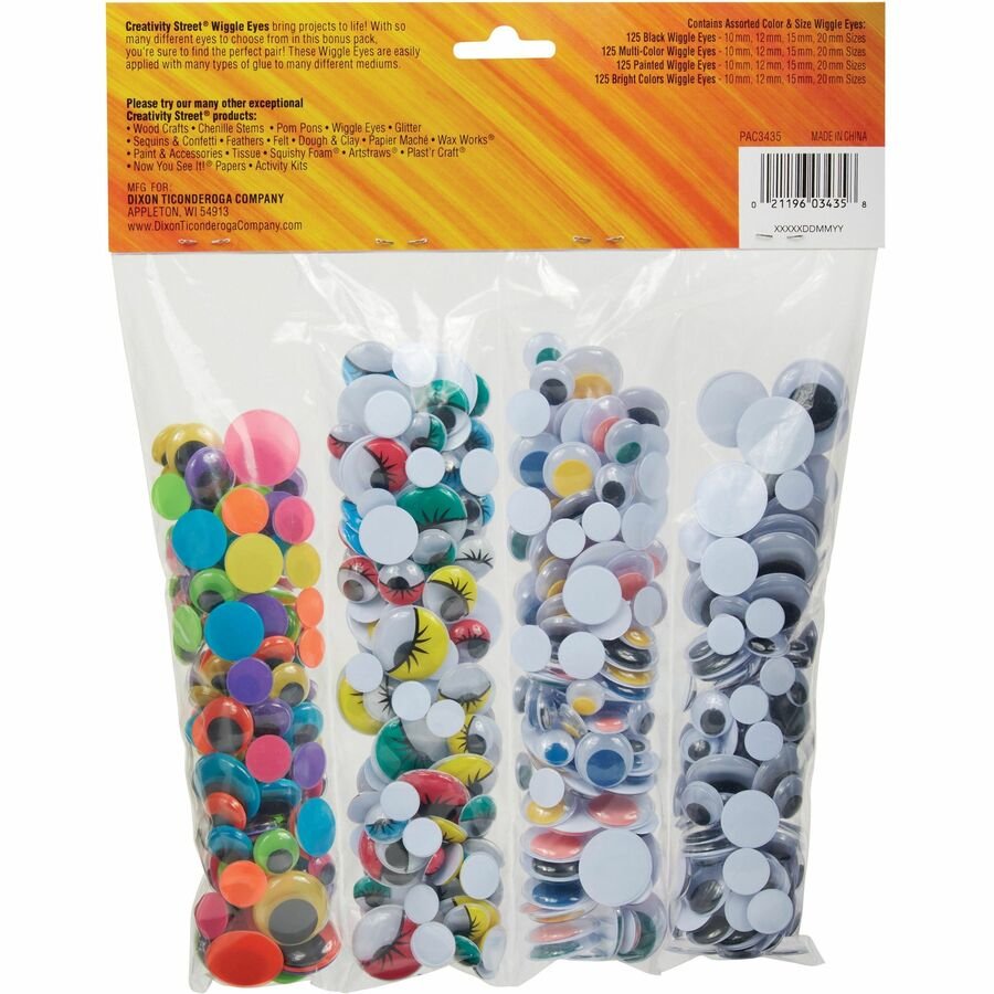 Wiggle Eyes bring projects to life. With so many different eyes to choose from in this bonus pack, you’re sure to find the perfect pair for your project. These Wiggle Eyes are easily applied with many types of glue to many different mediums. This multi-pack includes 125 pieces each of Black, Multi-Color, Painted and Bright Colors in assorted sizes of 10mm, 12mm, 15mm and 20mm. This creative fun for young minds is recommended for children ages 3 and up.