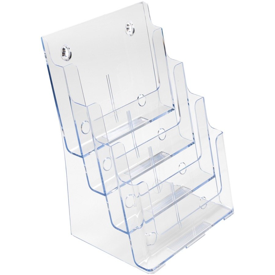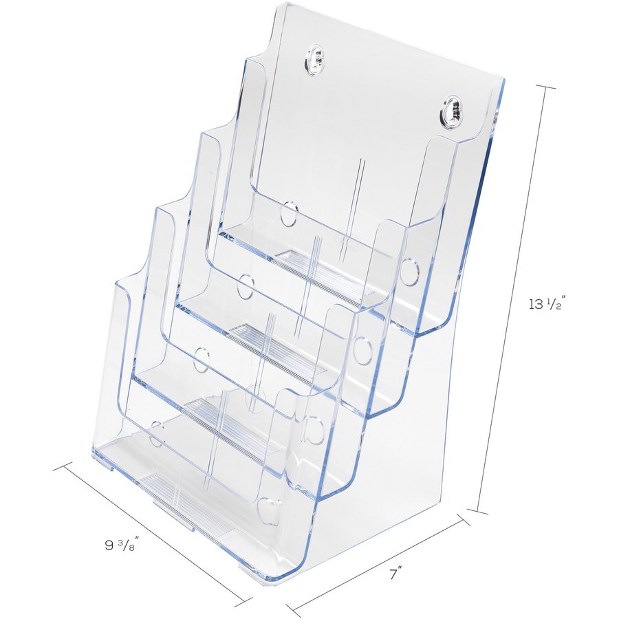 Compact, desktop literature holder features a four-pocket design so you can display a variety of leaflets on an incline and keep your literature in full view. Perfect for use in lobbies, restaurants, libraries and more. Each pocket displays literature in stacks up to 1-1/2″ thick. Literature holder is made of crystal-clear plastic. Rounded edges offer smooth appearance. Use as a stand-alone display on your countertop or mount on a wall using the built-in holes.