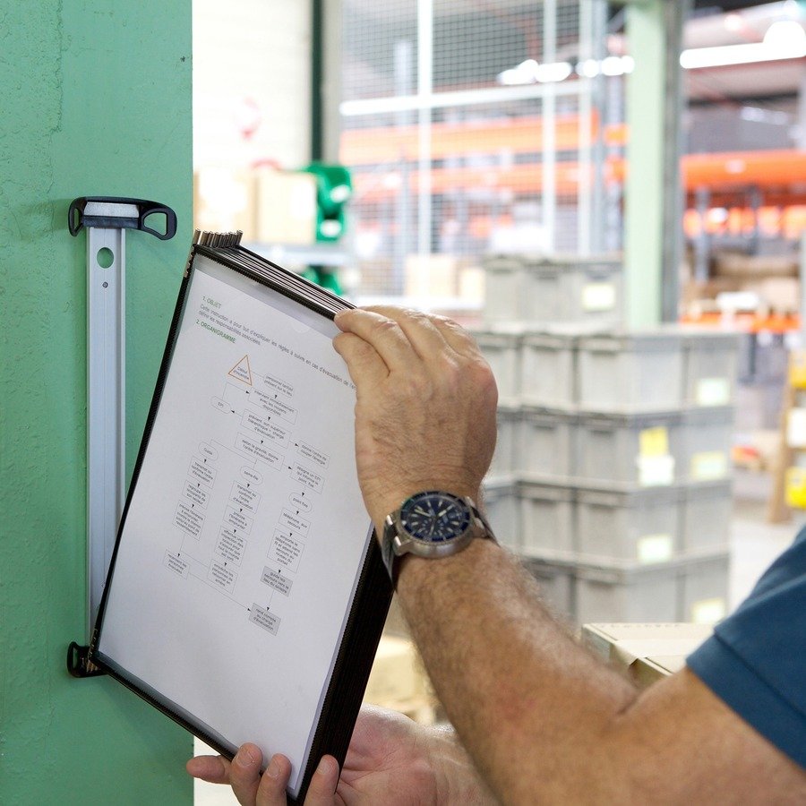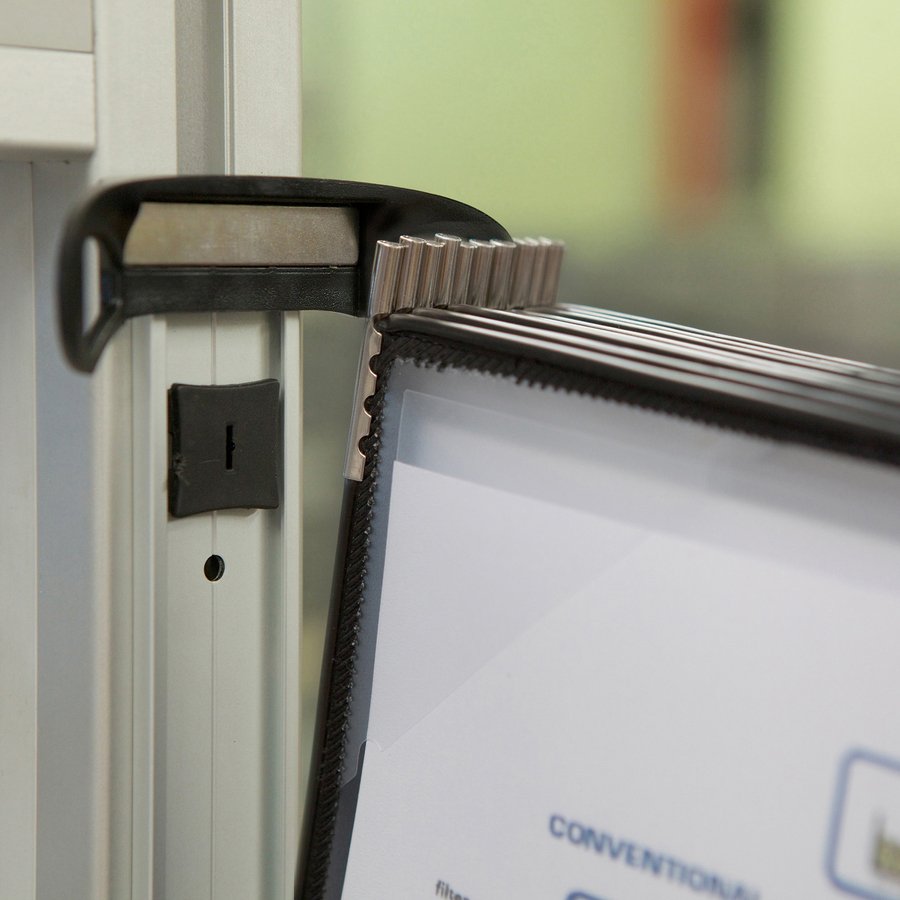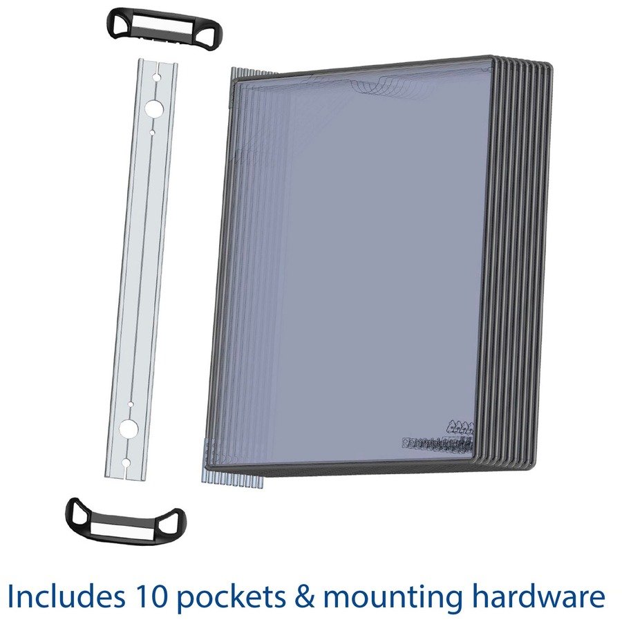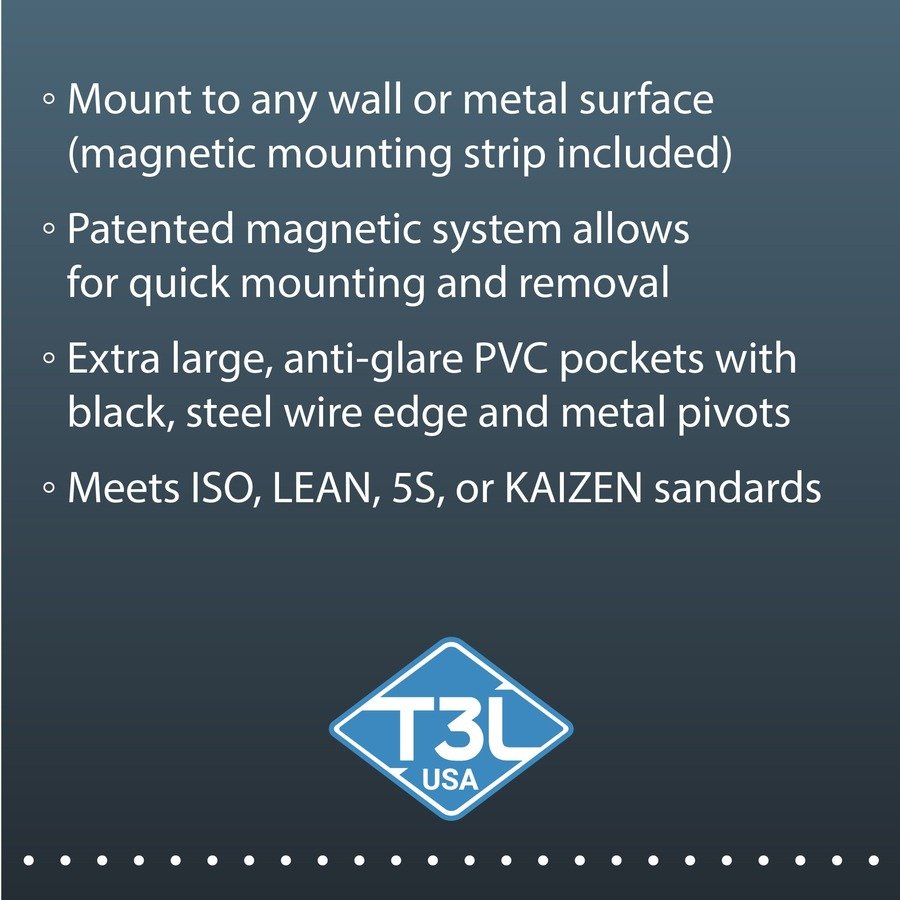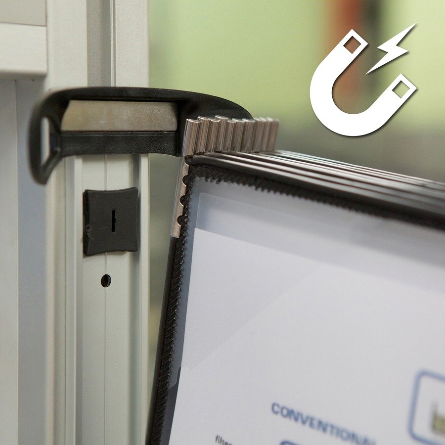Document display features a 10-pocket design to organize, protect and display your frequently referenced documents. Magnetic fixing system with neodynum magnets allows you to easily mount, remove and interchange the pockets. This unit is ideally adapted to industrial environments meeting ISO, LEAN, 5S or KAIZEN requirements. It can be mounted to any wall or metal surface with the included magnetic mount strip. The aluminum support bracket is corrosion-resistant and heat-resistant for lasting use. Easy-to-load openings allow you to quickly update your documents as needed.