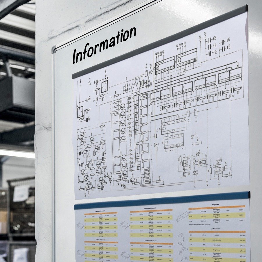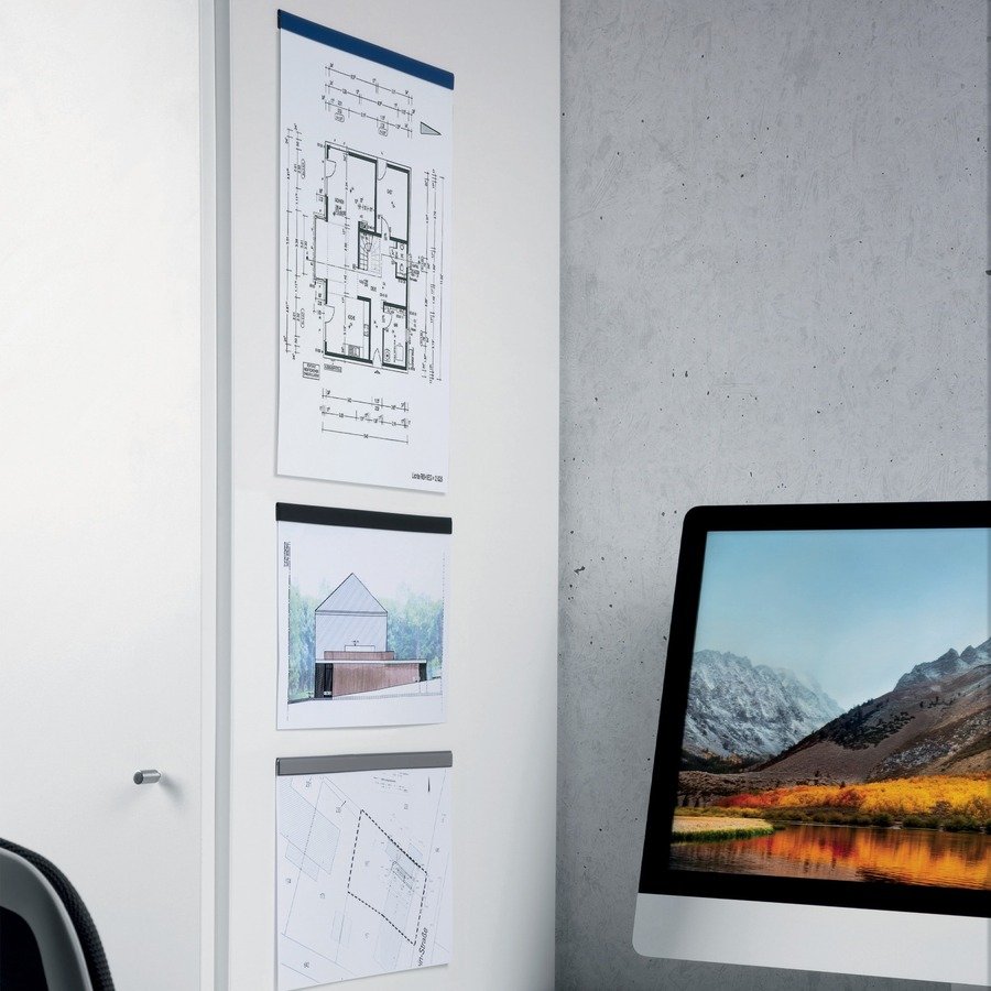 Attach documents quickly and easily with the Durafix Rail. Simply stick the magnet to your chosen surface, open the clip, place the note inside and close. Magnetic strip for information and posters in letter-size landscape and tabloid-size portrait format. Self-adhesive attachment allows a uniform appearance on smooth surfaces such as cabinets, glass doors, shop windows and whiteboards. Self-adhesive will not leave a residue when removed.