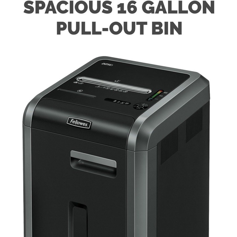 Marketing Information:Powershred 225Ci Cross-Cut Shredder can shred up to 22 sheets of paper per pass into 397 (5/32″ x 1-1/2″ Security Level P-4) cross-cut particles. This machine also safely shreds CDs/DVDs, credit cards, staples, paper clips and junk mail. Achieve hassle-free shredding with all of the features the 225Ci has to offer. Get three levels of advanced jam prevention with Fellowes 100 percent Jam Proof System that eliminates paper jams, powers through tough jobs and maximizes productivity. To protect more than your identity, the patented SafeSense Technology is designed with an electronic safety sensor that surrounds the paper entry and automatically disables the shredder when hands touch the paper opening. Also, the 225Ci’s SilentShred Technology and Energy Savings System allow this machine to integrate easily to any environment. With the ability to shred continuously, the 225Ci is ideal for shared use and includes a high-volume, 16-gallon removable basket.