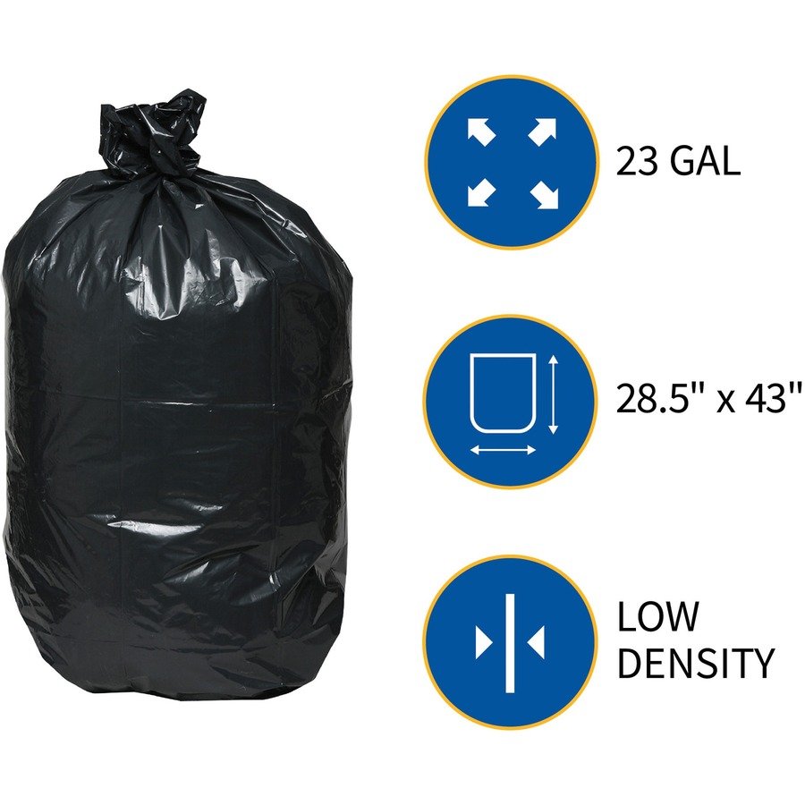 Medium Size – 23 gal Capacity – 28.50″ Width x 43″ Length – Low Density – Black – 112/Pallet – 150 Per Box – Office Waste, Food, Can – Recycled