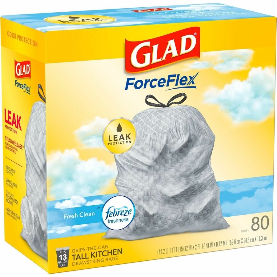 Fight nasty kitchen odors with Glad trash bags and the steady release of Febreze freshness. Glad Tall Kitchen Drawstring Trash Bags are designed with ForceFlex technology to give extra flex as they expand around sharp edges and heavy loads so you can pack them in while resisting tears, rips and punctures. A steady release of a fresh, clean scent with Febreze Freshness keeps your kitchen pleasantly fresh smelling with long-lasting odor control. Let the stretchable strength of Glad handle all the messes busy daily life can throw at it. With double-sided seals and a reinforced bottom, these bags are designed with RipGuard and LeakGuard technology to prevent seepage of liquids and keep trash contained. Durable Grips-The-Can Drawstring ensures a tight grip on the trash can to keep it in place. Keep your kitchen smelling clean with the stretchable strength of Glad. Bags are ideal for use in offices, schools, daycare centers, restaurants, hotels and other commercial facilities.