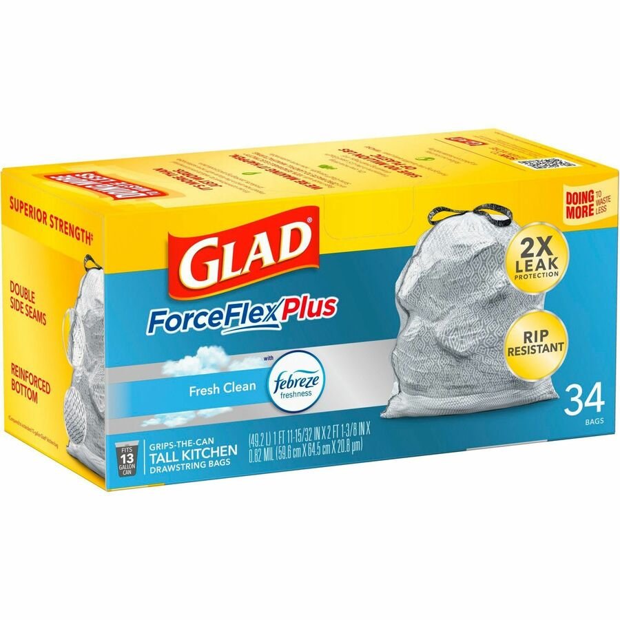 Glad ForceFlexPlus Tall Kitchen Drawstring Trash Bags provide twice the leak protection with double side seams and a reinforced bottom to guard against leaks and trap liquids in the bag. Designed with ForceFlexPlus technology, these trash bags provide two layers of strength and stretch for reliable leak protection. Plus, they trap, lock and neutralize odors with lasting Febreze freshness in Fresh Clean scent. What goes in the trash, stays in the trash with Glad bags equipped with RipGuard and LeakGuard technology. Glad’s two durable layers handle the most demanding trash with an outer layer to protect against leaks and a strong inner layer to prevent rips and tears. The Grips-The-Can Drawstring ensures that the bag stays in place, making it easy to close and carry out the trash.