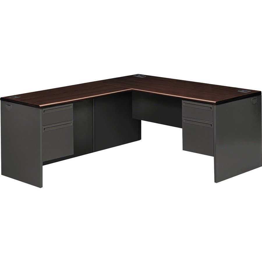 Modular steel desking combines your choice of easy-care laminate tops with sturdy steel body for a complete desk solution that’s both attractive and durable. Mahogany laminate tops feature visually appealing rounded edges for a polished look and enhance your comfort. Wire management is made easy with cord-management grommets on desks and end panels to facilitate cable connections between desks. Desking also features steel ball-bearing suspension in all box and file drawers, “Tru-fit” mitered drawer fronts for better visual alignment, one pencil tray per unit except returns, and full-extension, triple-tied cradles on all file drawers for full access to interior contents. Desking meets or exceeds applicable ANSI/BIFMA standards.