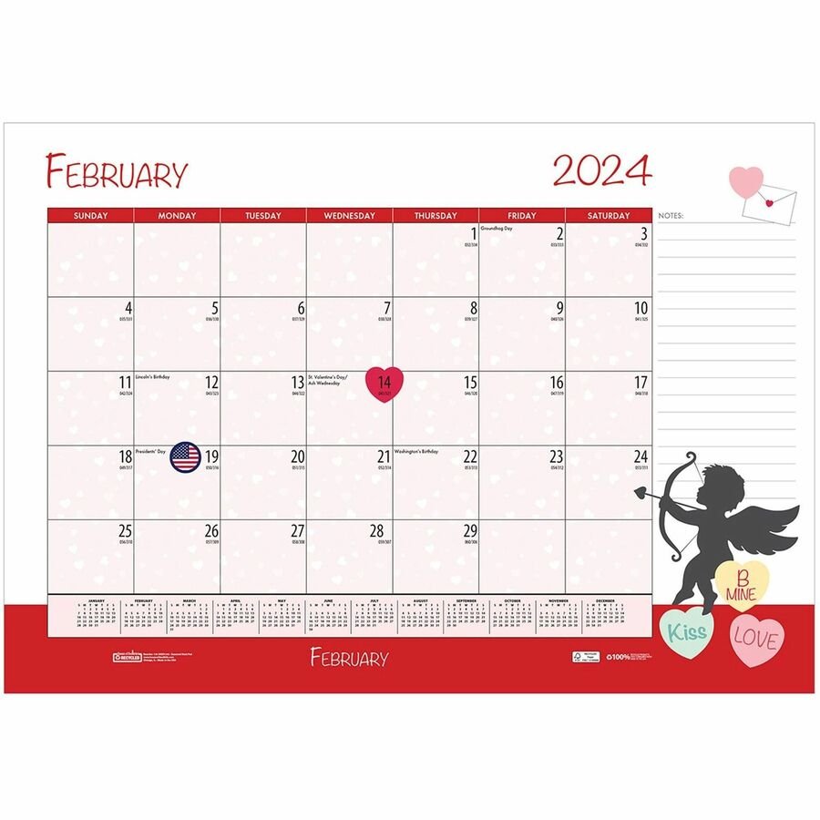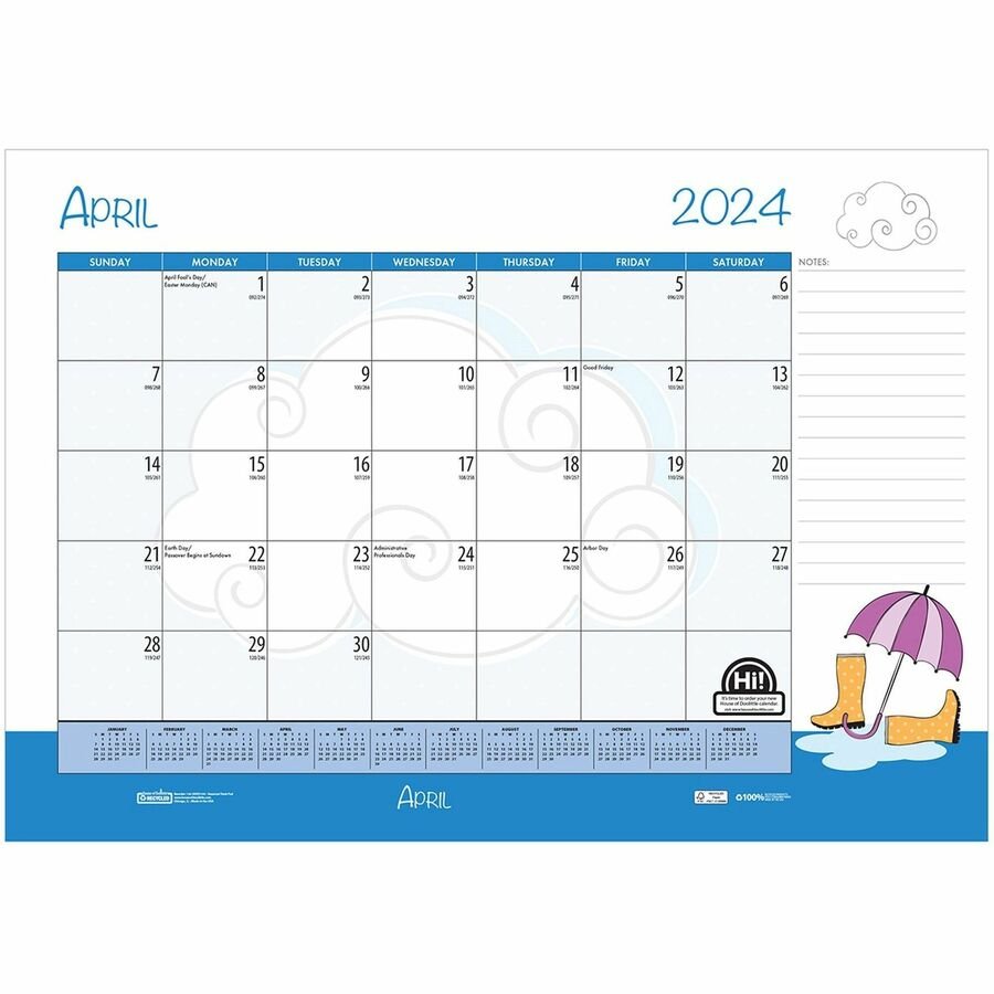 Add a little fun to your day with this Academic Seasonal/Holiday Desk Pad. This pad features a different animated theme each month. Dated planning pages range 12 months from July to June. One-page-per-month includes unruled daily blocks for open planning, Sunday-through-Saturday scheduling, count of days/days remaining, a notes section, holidays and a full-year reference calendar at the bottom. Bound calendar pages are perforated at the top and secured at the bottom with two matching chipboard reinforced leatherette corners. FSC certified paper is made with a high percentage of post-consumer recycled paper and soy-based inks.