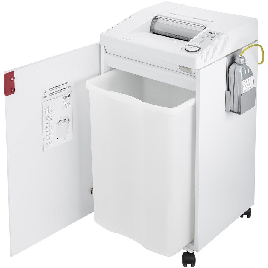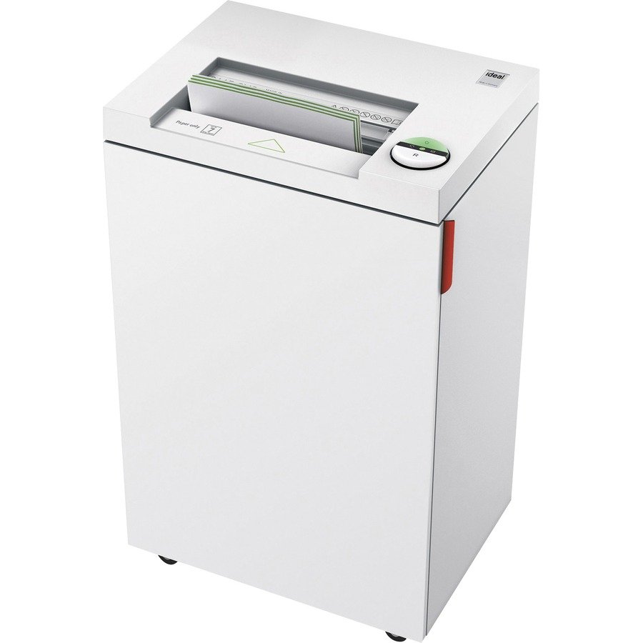 Marketing Information:Super micro-cut office shredder with a P-7 security level features an Easy Switch control element that uses illuminated color codes and symbols to indicate operational status and functions as an emergency stop switch. Electronically controlled, transparent safety shield in the feed opening offers an additional level of safety to ensure proper use. Electronic Capacity Control (ECC) indicator prevents jams by monitoring sheet capacity levels during operation. High-quality, hardened steel cutting shafts handle staples, paper clips and more. Sturdy Twin Drive System with a fully enclosed gearbox housing provides long-lasting use and efficiency. High-quality cabinet is mounted on casters for effortless mobility. For environmentally friendly performance, the convenient shred bin does not require disposable shred bags. Automatic oil injection automatically lubricates the cutting shafts while dressing for optimal use. Office shredder is designed to shred up to 8 sheets of paper at a time.