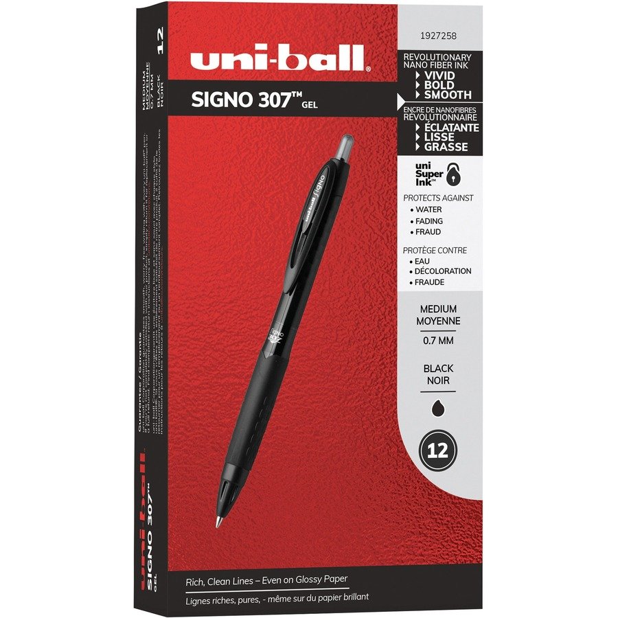 Retractable gel ink pen delivers quick-drying ink that is perfect for the left-handed. Stylish barrel features a comfortable rubber grip, tough metal ball tip and convenient pocket clip. Grip and accents match the black ink color. Permanent, water-resistant gel ink provides a smooth and effortless writing experience.