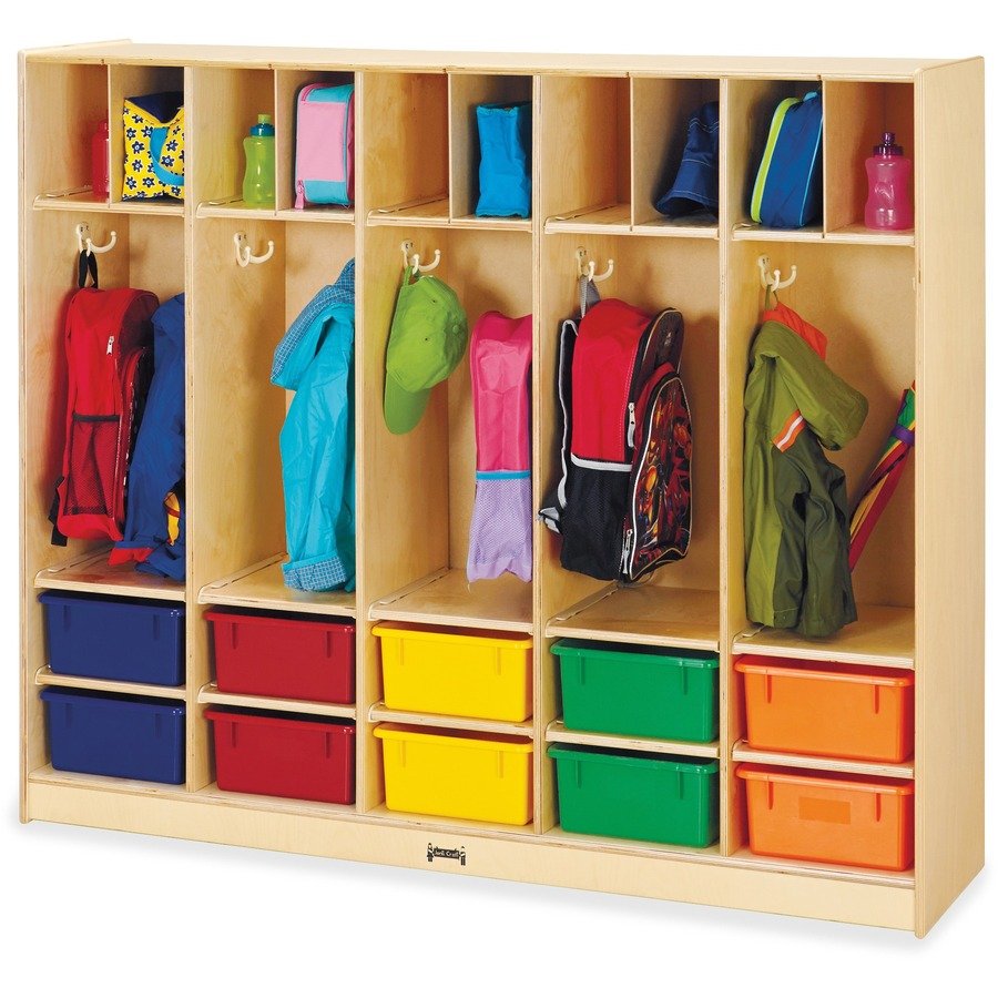 Four-section coat locker uses two, double coat hooks in each section to hang jackets, backpacks and more. Top shelves and bottom shelves provide additional space for boots and lunch boxes. Laminate is durable and features an easy-to-clean surface. KYDZSafe rounded edges allow children to play safely without getting hurt by sharp edges or corners. Kickplate prevents children from losing small items underneath. TRUEdge is permanently thermo-fused to the edges to prevent chipping. Dowel-pin construction prevents weakening at the joints. Standard Write-n-Wipe recessed backs can be easily wiped clean.
