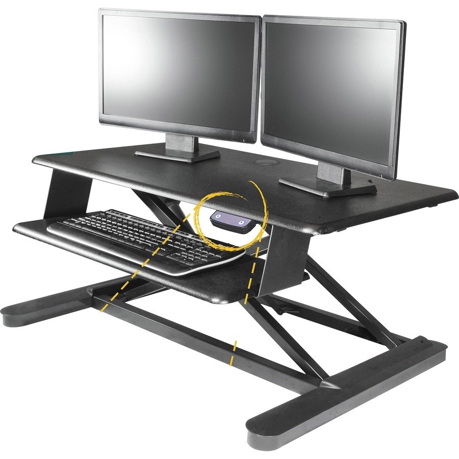 Adjust your work space up and down with the push of a button using the Electric Sit to Stand Workstation. Powerful electric motor lifts up to 60 lb. on the platform vertically from 6-3/10″ to 23-2/5″. Large platform measures 35″ wide x 21″ deep and holds two 24″ monitors. Desk riser also includes a keyboard tray. Grommet hole centered near the back edge mounts optional monitor arms for single and double monitors or it can be used for cable management. Electric mechanism is CE/UL certified.