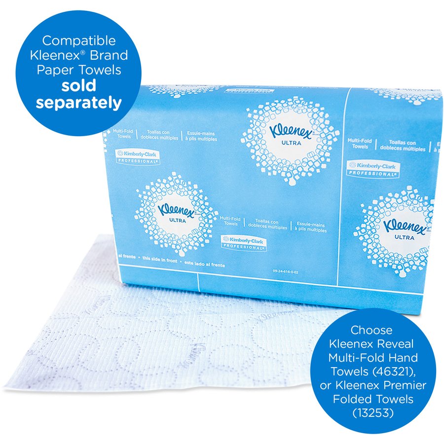 Solve the daily challenge of keeping counters and floors dry and clean with this countertop system. Countertop system provides soft, absorbent hand towels right at the sink, where they’re needed most, for an upgraded hand-drying experience. Visitors take a hand towel without taking a step so you can say goodbye to water splashes and sprays on floors and countertops. Overstuff prevention stops you from overloading the system for easy access to towels. Easy-to-use design provides one-at-a-time dispensing that’s smooth, quiet and virtually tab-free. Larger size has a 15 percent higher capacity than competing systems to prevent frequent refills. Countertop system is designed for Kleenex Reveal Hand Towels and Kleenex Scottfold paper towels (sold separately).