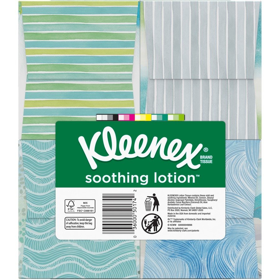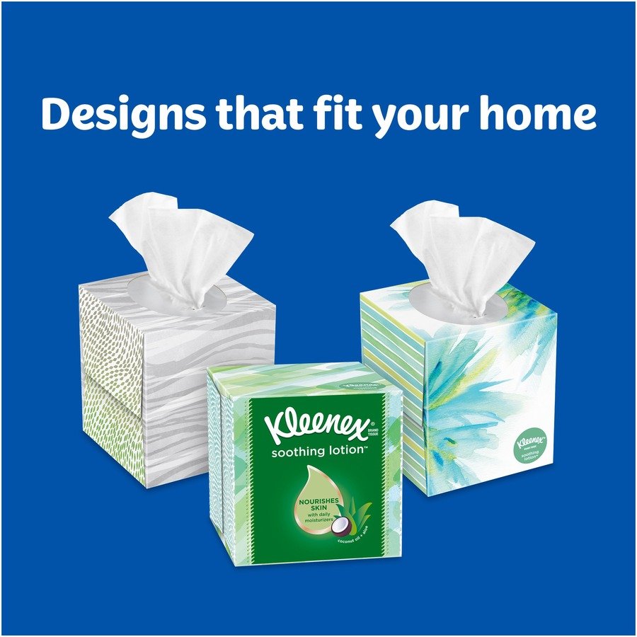 Kleenex Soothing Lotion Facial Tissues are infused with the ingredients of coconut oil, aloe and Vitamin E to nourish skin with daily moisturizers and help prevent redness. Three-layer tissues are dermatologist-tested and clinically proven to be the softest lotion tissue (among national brands). Tissue boxes feature a variety of colors and designs that complement your home, office or business decor. Design may vary from the image shown.