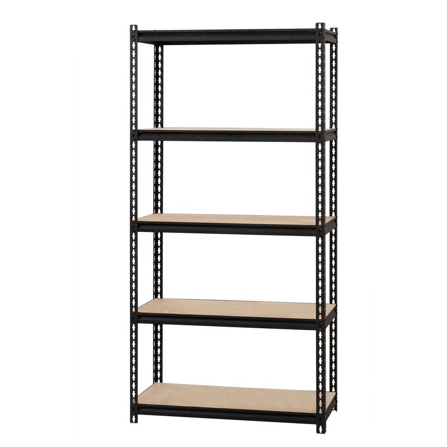 Iron Horse Riveted Steel Shelving offers a boltless design for simple assembly. It holds up to 2,300 lb. of evenly distributed weight on its particleboard shelving. The five shelves are supported by a black steel frame with a powder-coat finish for durability. Shelving assembles vertically or horizontally.