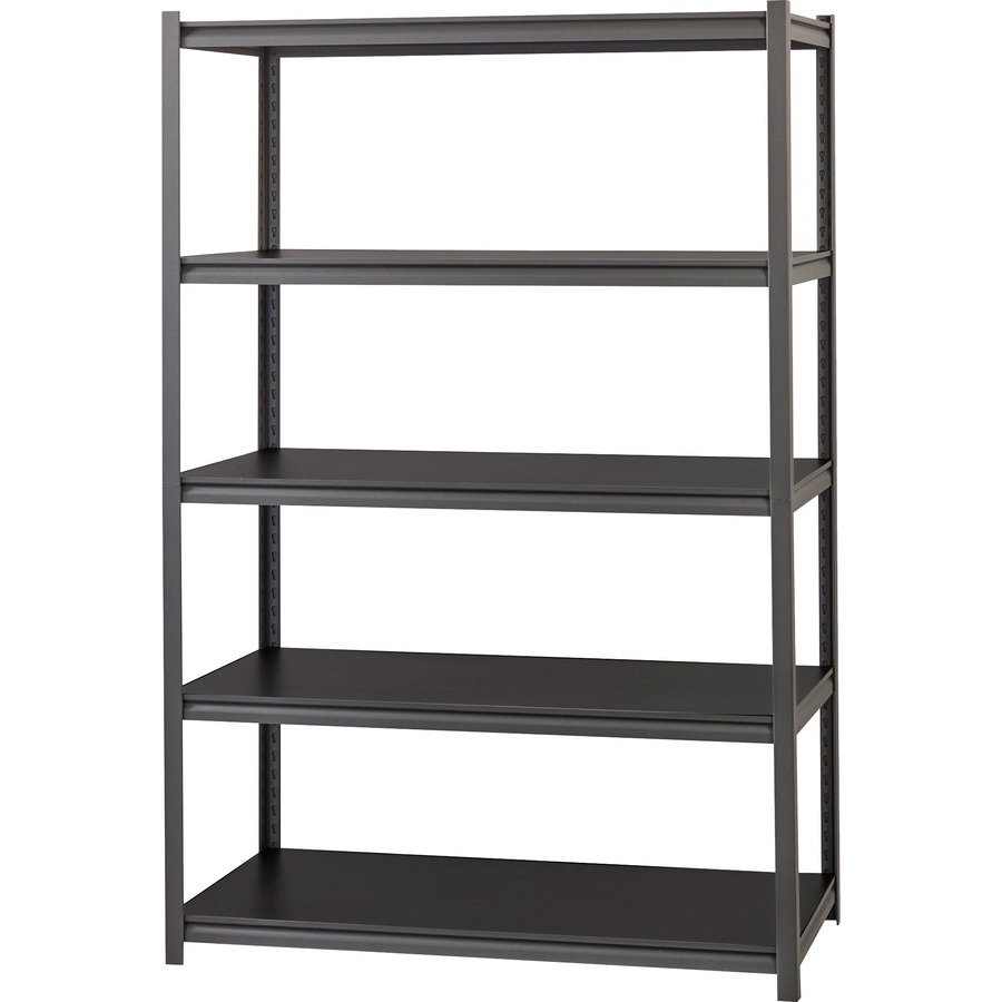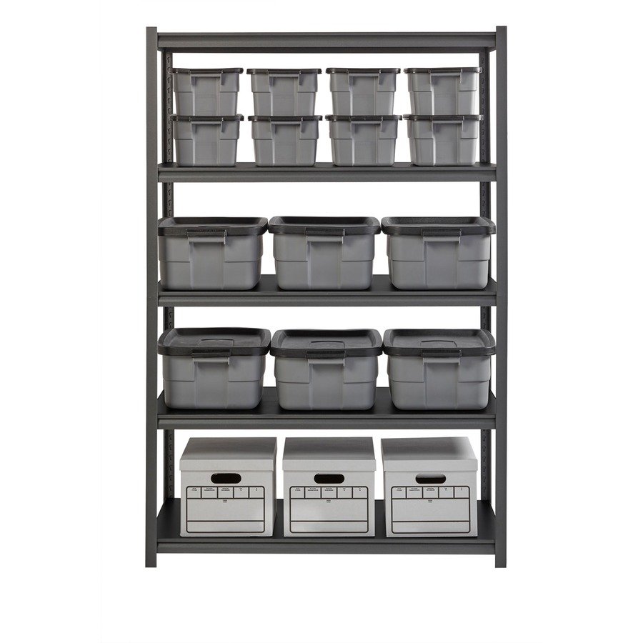 Iron Horse Riveted Steel Shelving offers a boltless design for simple assembly. It holds up to 3,200 lb. of evenly distributed weight on its black laminate shelving. The five shelves are supported by a steel frame with a powder-coat finish in gunmetal gray for durability. Shelving assembles vertically or horizontally.