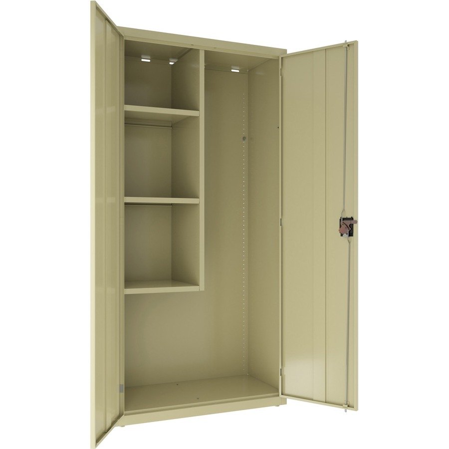 Janitorial cabinet with four shelves offers a sturdy, private storage space to organize cleaning and maintenance supplies. Lock up belongings using the recessed locking handle with the three-point locking system and core-removable lock. Durable cabinet is made of welded steel. Three shelves adjust in 1″ increments to fit your storage needs. Each shelf holds 180 lb. Tall compartment makes room for broom, mops and other long cleaning tools. Steel construction has a powder-coat finish to make it last longer. Cabinet features hinged doors for easy access and includes one key. It meets or exceeds ANSI/BIFMA standards.