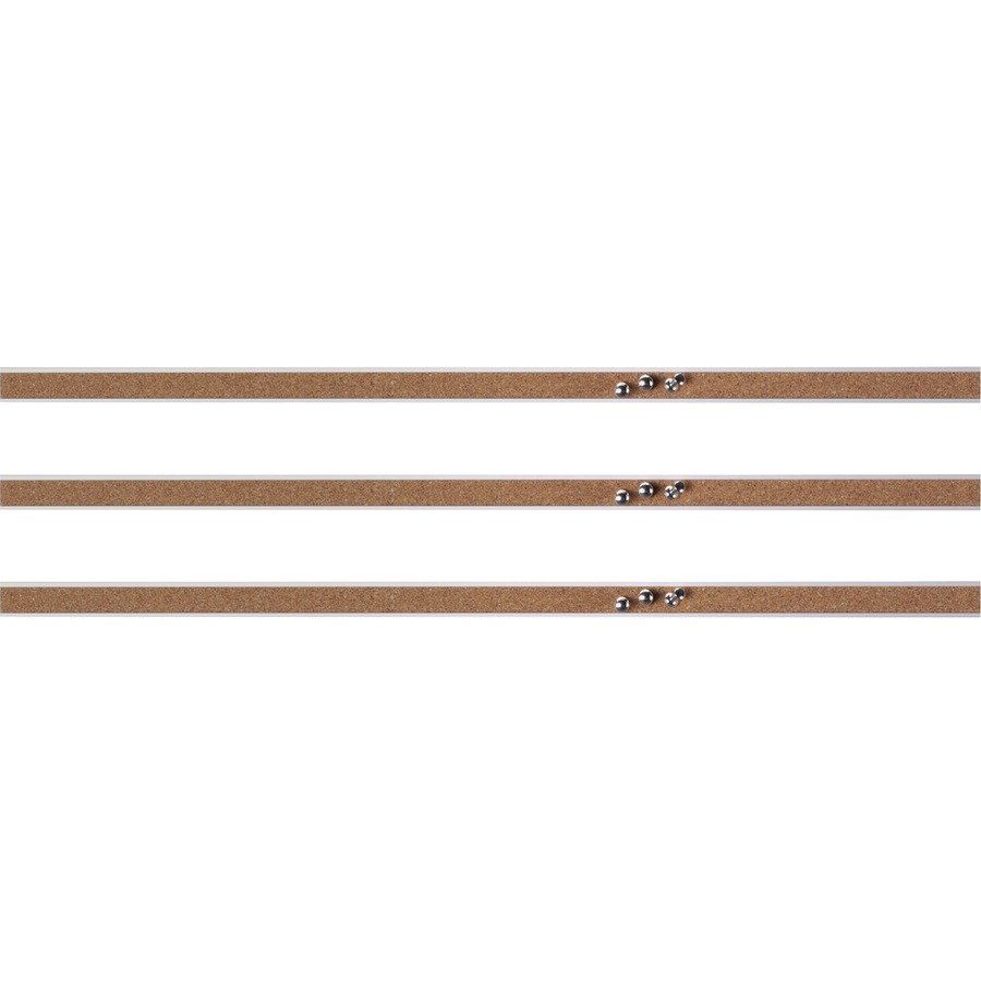 Tack up notes and reminders with this 48″ natural cork bulletin bar without taking up a lot of space. Self-healing cork surface eliminates unsightly pinholes. Bulletin bar is framed with smooth, anodized aluminum. It easily installs above whiteboards and chalkboards or secures directly to any wall. Easily mount by adhesive foam tape or magnetic strip. Ends of multiple bars can be joined to increase display length. Bulletin bar strip includes three pushpins.