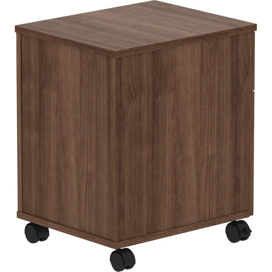 Mobile pedestal is part of the Lorell Relevance Series, versatile and stylish office furniture that configures to meet your needs. Walnut laminate exterior matches other units in the series for a cohesive, professional look. Locking pedestal includes four dual-wheeled casters (two locking) for easy mobility, one box drawer for storing supplies and one file drawer for securing your letter-size hanging file folders. Adjustable leveling feet help keep the pedestal even on uneven surfaces.